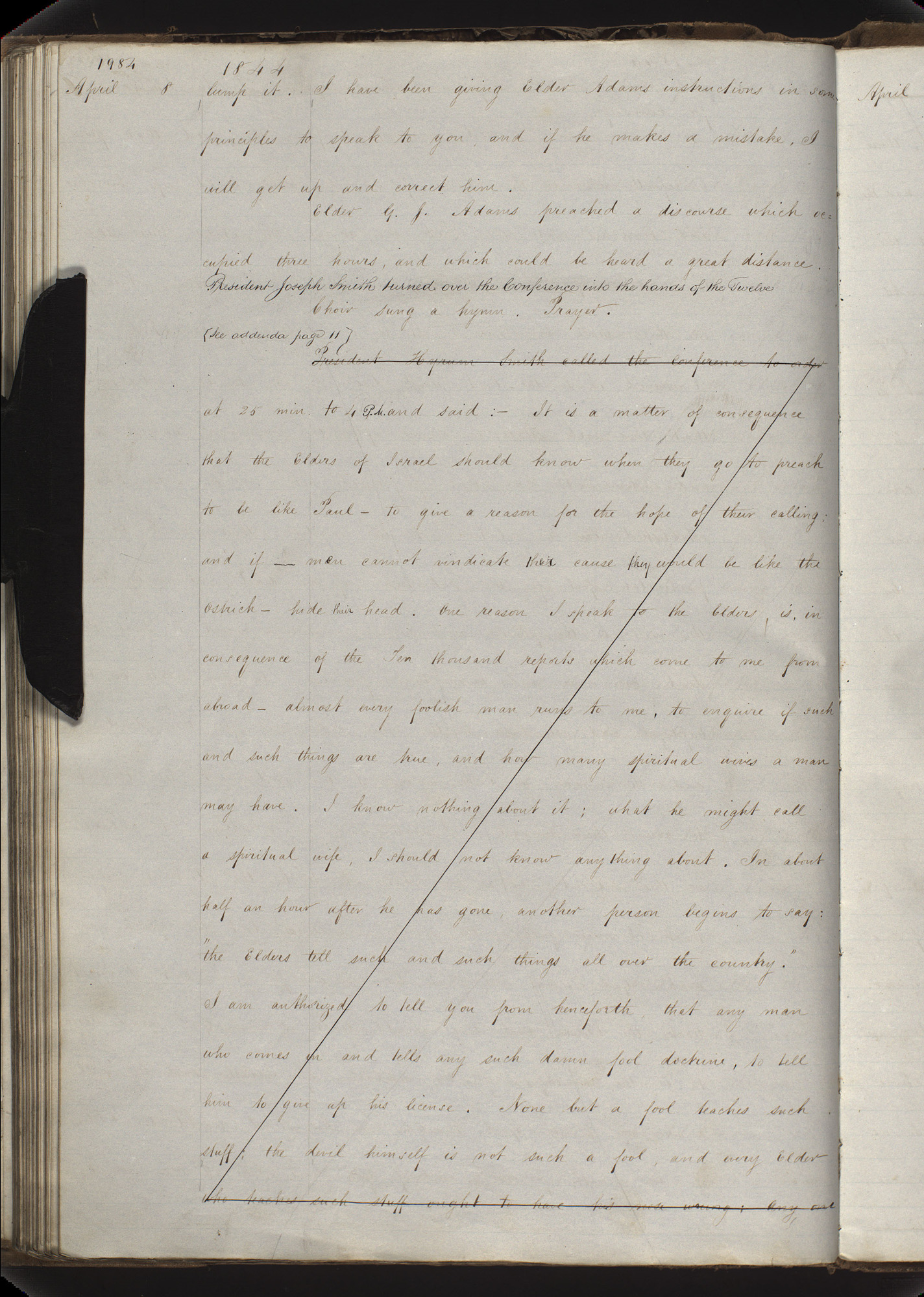 • Minutes of a 6–9 October 1843 general conference inserted under the date of 9 October at which pled his case in regard to his 13 August 1843 disfellowshipment and was permitted to continue as counselor in the First Presidency.