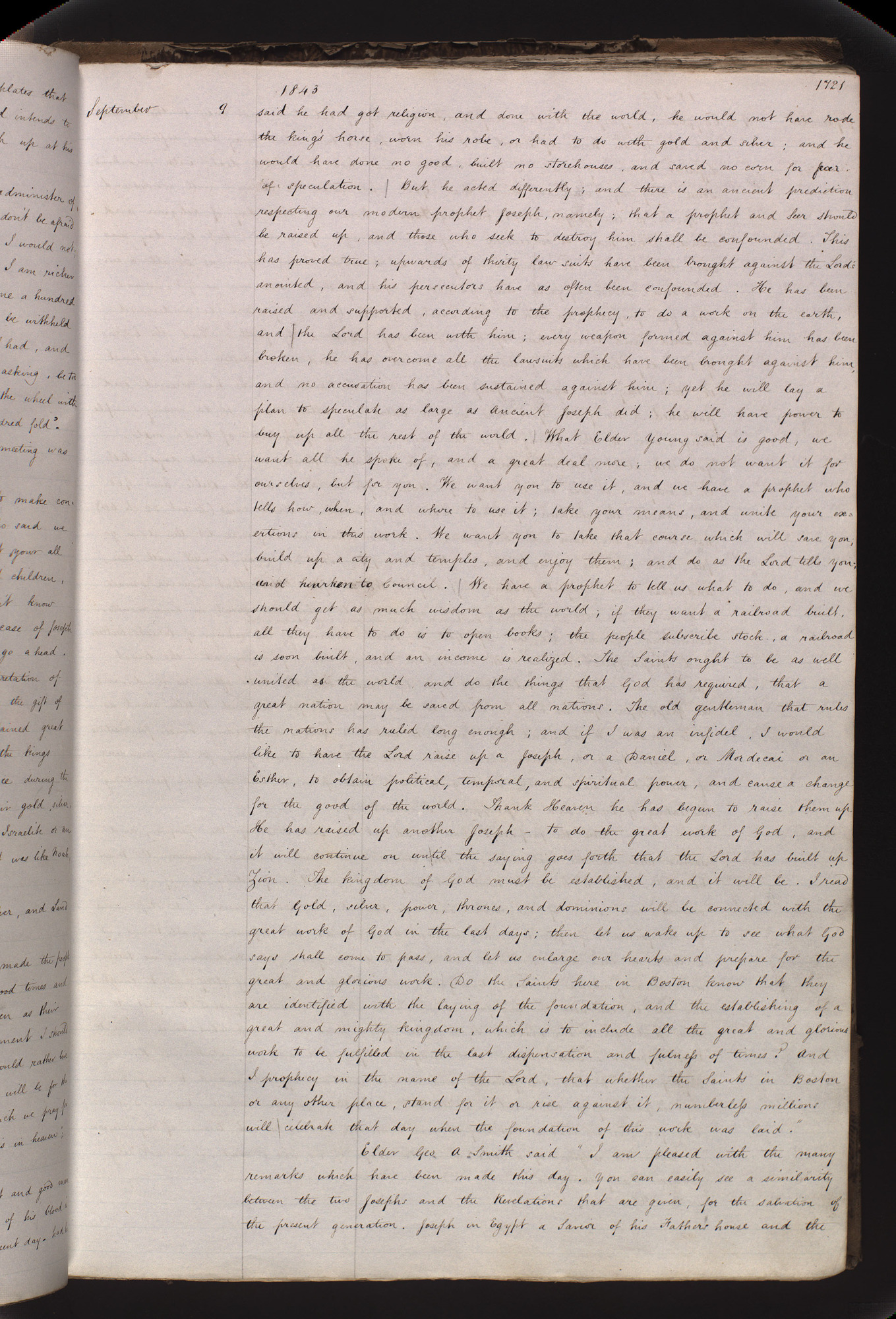 <September 9> said he had got religion, and done with the world, he would not have rode the king’s horse, worn his robe, or had to do with gold and silver; and he would have done no good, built no storehouses, and saved no corn for fear of speculation. But he acted differently; and there is an ancient prediction respecting our modern prophet Joseph, namely; that a prophet and Seer should be raised up, and those who seek to destroy him shall be confounded. This has proved true; upwards of thirty law suits have been brought against the Lord’s anointed, and his persecutors have as often been confounded. He has been raised and supported, according to the prophecy, to do a work on the earth, and the Lord has been with him; every weapon formed against him has been broken, he has overcome all the lawsuits which have been brought against him, and no accusation has been sustained against him; yet he will lay a plan to speculate as large as Ancient Joseph did; he will have power to buy up all the rest of the world. What said is good, we want all he spoke of, and a great deal more; we do not want it for ourselves, but for you. We want you to use it, and we have a prophet who tells how, when, and where to use it; take your means, and unite your exertions in this work. We want you to take that course which will save you; build up a city and temples, and enjoy them; and do as the Lord tells you; and hearken to Council. We have a prophet to tell us what to do, and we should get as much wisdom as the world; if they want a railroad built, all they have to do is to open books; the people subscribe stock, a railroad is soon built, and an income is realized. The Saints ought to be as well united as the world and do the things that God has required, that a great nation may be saved from all nations. The old gentleman that rules the nations has ruled long enough; and if I was an infidel, I would like to have the Lord raise up a Joseph, or a Daniel, or Mordecai or an Esther, to obtain political, temporal, and spiritual power, and cause a change for the good of the world. Thank Heaven he has begun to raise them up. He has raised up another Joseph— to do the great work of God, and it will continue on until the saying goes forth that the Lord has built up Zion. The kingdom of God must be established, and it will be. I read that Gold, silver, power, thrones, and dominions will be connected with the great work of God in the last days; then let us wake up [HC 6:16] to see what God says shall come to pass, and let us enlarge our hearts and prepare for the great and glorious work. Do the Saints here in know that they are identified with the laying of the foundation, and the establishing of a great and mighty kingdom, which is to include all the great and glorious work to be fulfilled in the last dispensation and fulness of times? And I prophecy in the name of the Lord, that whether the Saints in or any other place, stand for it or rise against it, numberless millions will celebrate that day when the foundation of this work was laid.”