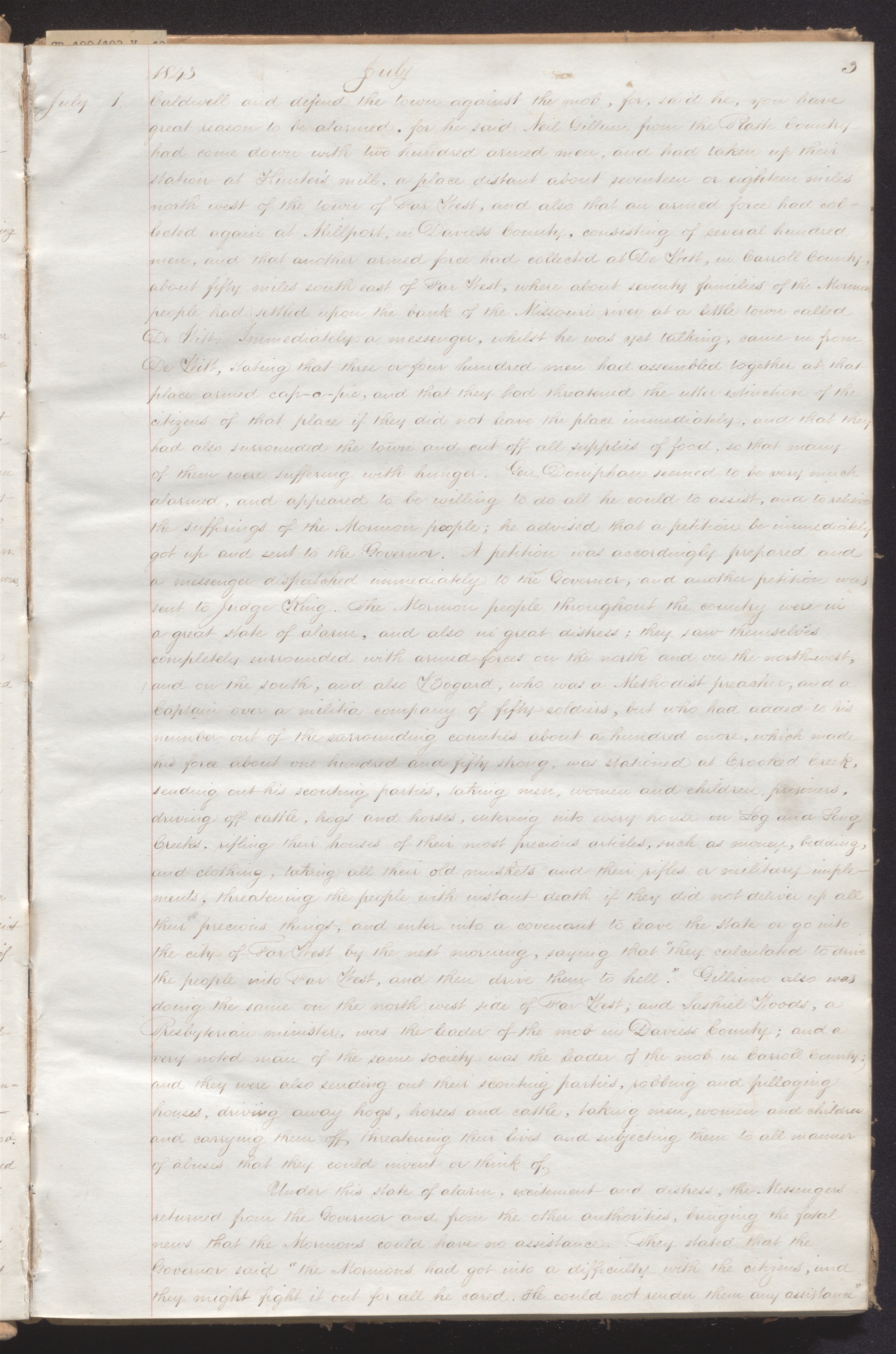 JS, History, 1838–1856, vol. E-2, created 18 Apr.–6 Aug. 1856; handwriting of ; 83 pages; CHL. This is a first part of a copy of the fifth volume of a six-volume manuscript history of the church (JS History, 1838–1856, vol. E-1), and covers the period from 1 to 19 July 1843. The copy also comprises four other volumes, labeled A-2, B-2, C-2, and D-2, and continues through 19 July 1843. The copy was discontinued 6 Aug. 1856 “by the advice of President ” (JS History, 1838–1856, vol. E-2, p. 83).