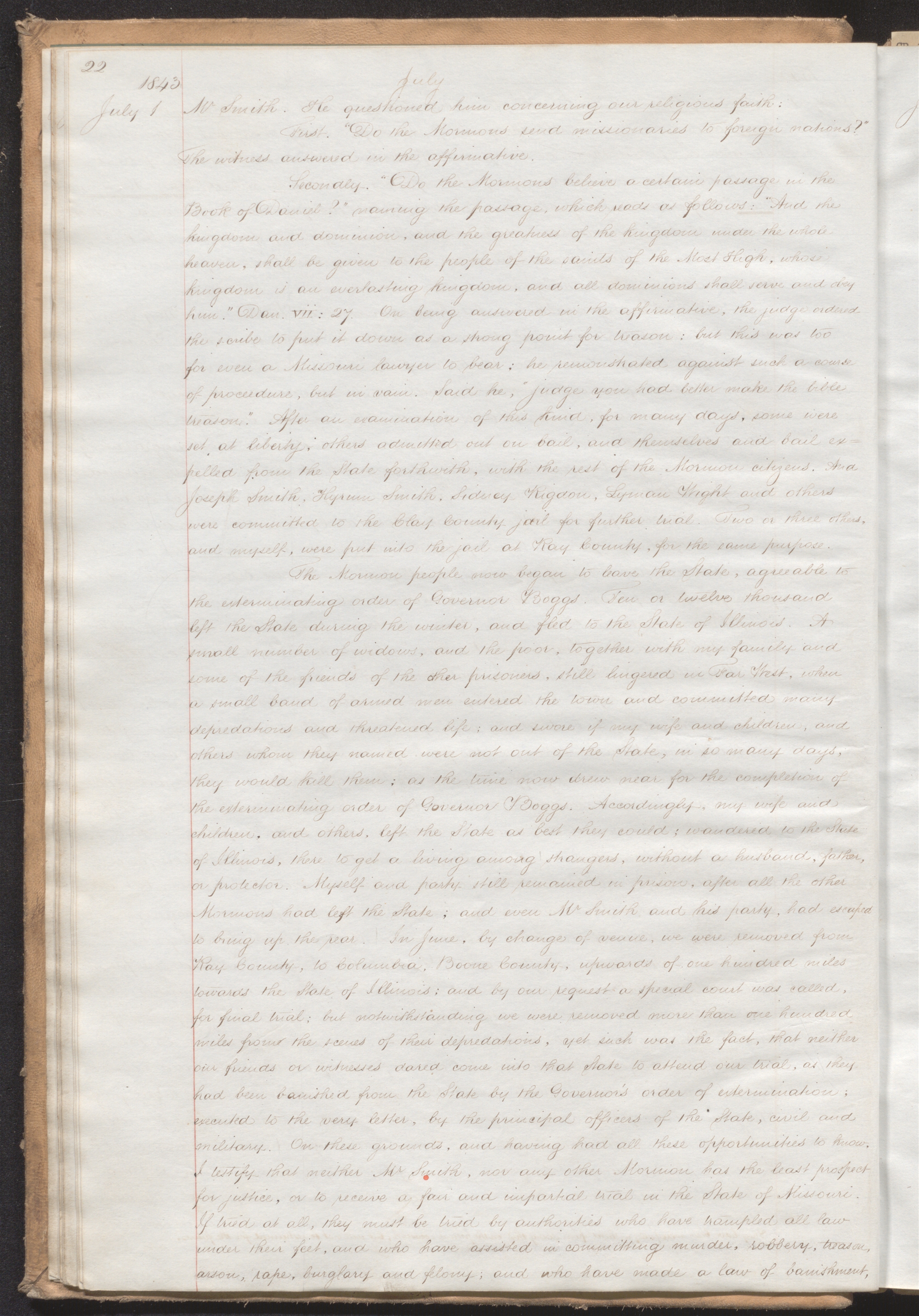 JS, History, 1838–1856, vol. E-2, created 18 Apr.–6 Aug. 1856; handwriting of ; 83 pages; CHL. This is a first part of a copy of the fifth volume of a six-volume manuscript history of the church (JS History, 1838–1856, vol. E-1), and covers the period from 1 to 19 July 1843. The copy also comprises four other volumes, labeled A-2, B-2, C-2, and D-2, and continues through 19 July 1843. The copy was discontinued 6 Aug. 1856 “by the advice of President ” (JS History, 1838–1856, vol. E-2, p. 83).
