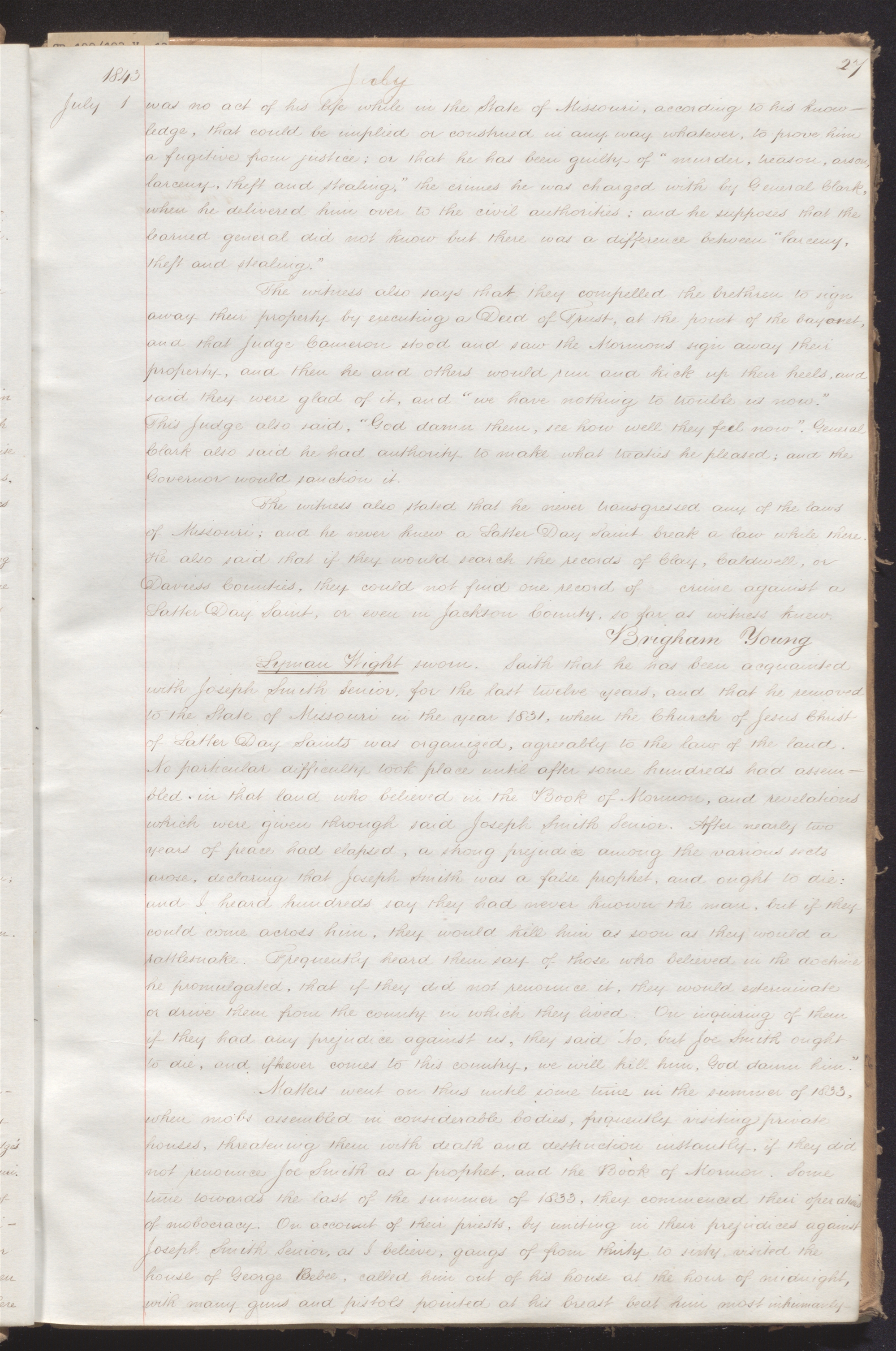 JS, History, 1838–1856, vol. E-2, created 18 Apr.–6 Aug. 1856; handwriting of ; 83 pages; CHL. This is a first part of a copy of the fifth volume of a six-volume manuscript history of the church (JS History, 1838–1856, vol. E-1), and covers the period from 1 to 19 July 1843. The copy also comprises four other volumes, labeled A-2, B-2, C-2, and D-2, and continues through 19 July 1843. The copy was discontinued 6 Aug. 1856 “by the advice of President ” (JS History, 1838–1856, vol. E-2, p. 83).