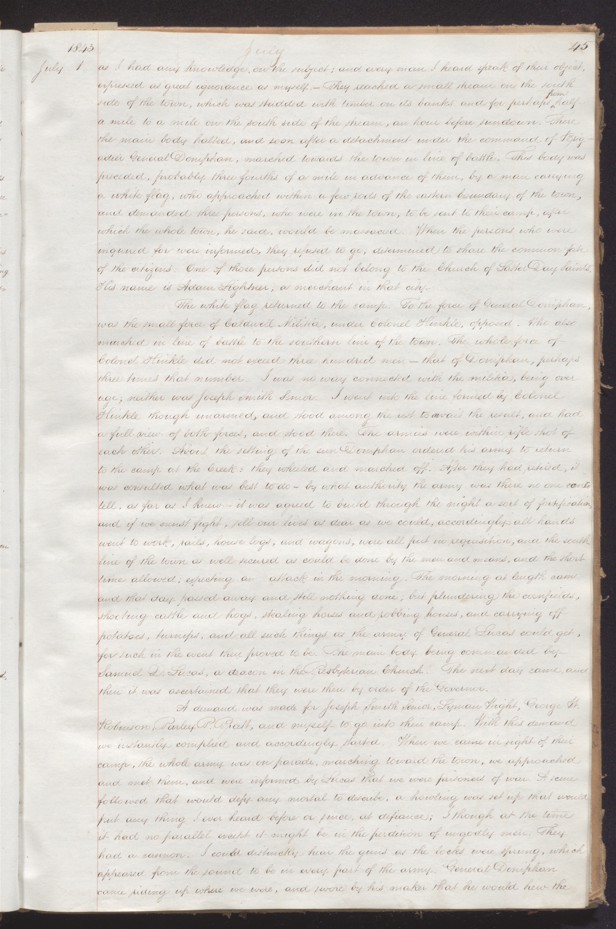 JS, History, 1838–1856, vol. E-2, created 18 Apr.–6 Aug. 1856; handwriting of ; 83 pages; CHL. This is a first part of a copy of the fifth volume of a six-volume manuscript history of the church (JS History, 1838–1856, vol. E-1), and covers the period from 1 to 19 July 1843. The copy also comprises four other volumes, labeled A-2, B-2, C-2, and D-2, and continues through 19 July 1843. The copy was discontinued 6 Aug. 1856 “by the advice of President ” (JS History, 1838–1856, vol. E-2, p. 83).