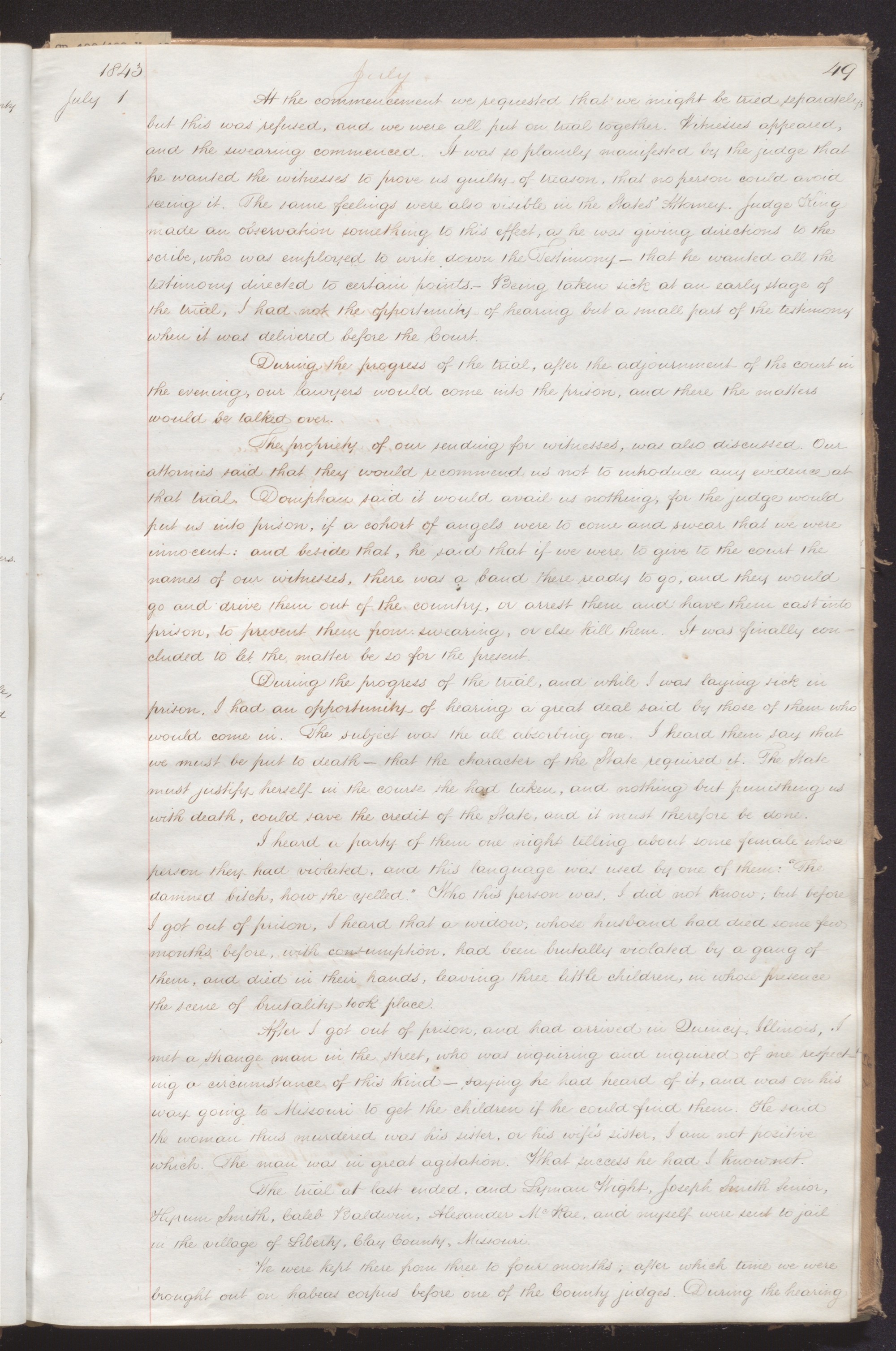 JS, History, 1838–1856, vol. E-2, created 18 Apr.–6 Aug. 1856; handwriting of ; 83 pages; CHL. This is a first part of a copy of the fifth volume of a six-volume manuscript history of the church (JS History, 1838–1856, vol. E-1), and covers the period from 1 to 19 July 1843. The copy also comprises four other volumes, labeled A-2, B-2, C-2, and D-2, and continues through 19 July 1843. The copy was discontinued 6 Aug. 1856 “by the advice of President ” (JS History, 1838–1856, vol. E-2, p. 83).