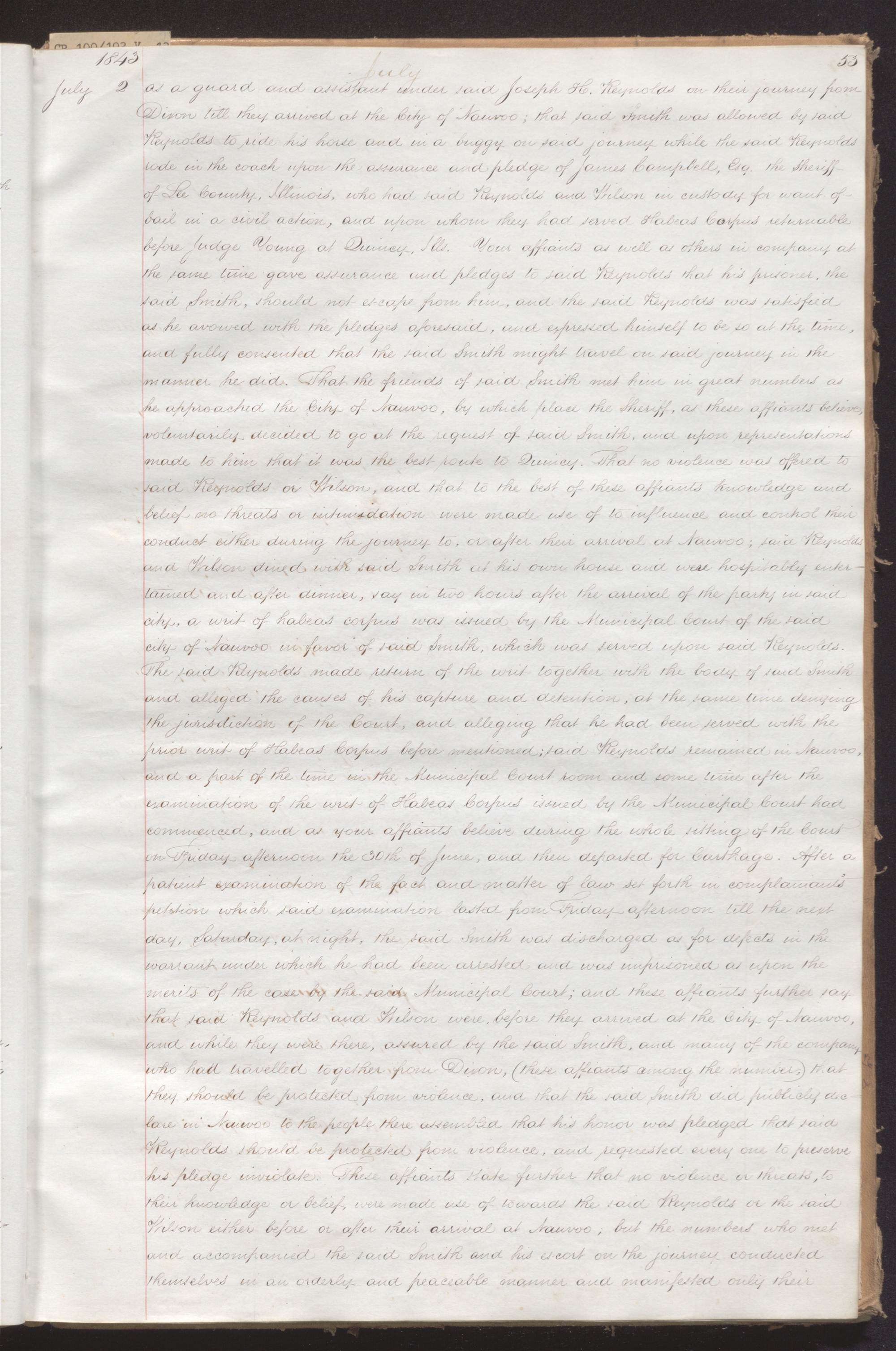 JS, History, 1838–1856, vol. E-2, created 18 Apr.–6 Aug. 1856; handwriting of ; 83 pages; CHL. This is a first part of a copy of the fifth volume of a six-volume manuscript history of the church (JS History, 1838–1856, vol. E-1), and covers the period from 1 to 19 July 1843. The copy also comprises four other volumes, labeled A-2, B-2, C-2, and D-2, and continues through 19 July 1843. The copy was discontinued 6 Aug. 1856 “by the advice of President ” (JS History, 1838–1856, vol. E-2, p. 83).