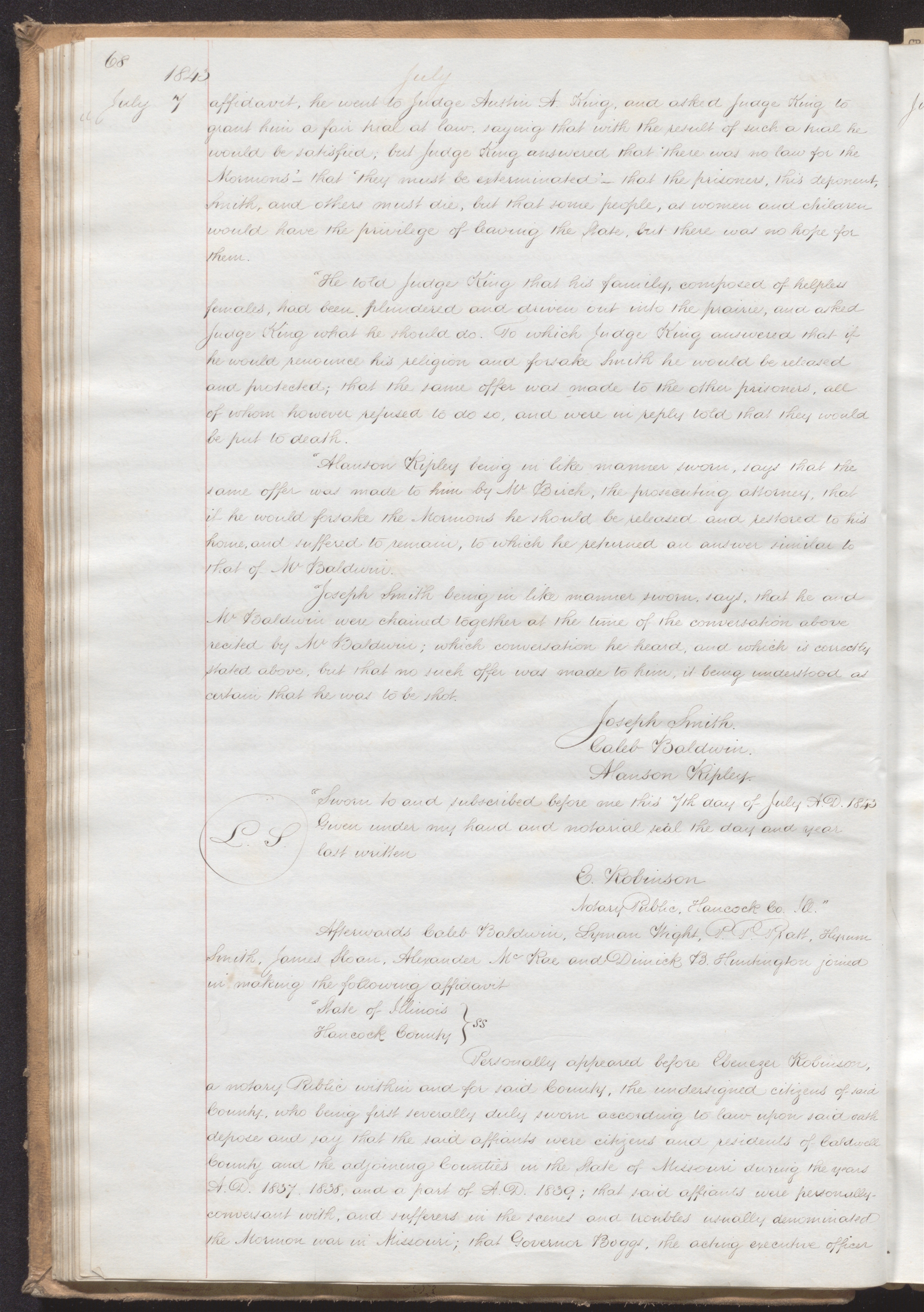 JS, History, 1838–1856, vol. E-2, created 18 Apr.–6 Aug. 1856; handwriting of ; 83 pages; CHL. This is a first part of a copy of the fifth volume of a six-volume manuscript history of the church (JS History, 1838–1856, vol. E-1), and covers the period from 1 to 19 July 1843. The copy also comprises four other volumes, labeled A-2, B-2, C-2, and D-2, and continues through 19 July 1843. The copy was discontinued 6 Aug. 1856 “by the advice of President ” (JS History, 1838–1856, vol. E-2, p. 83).