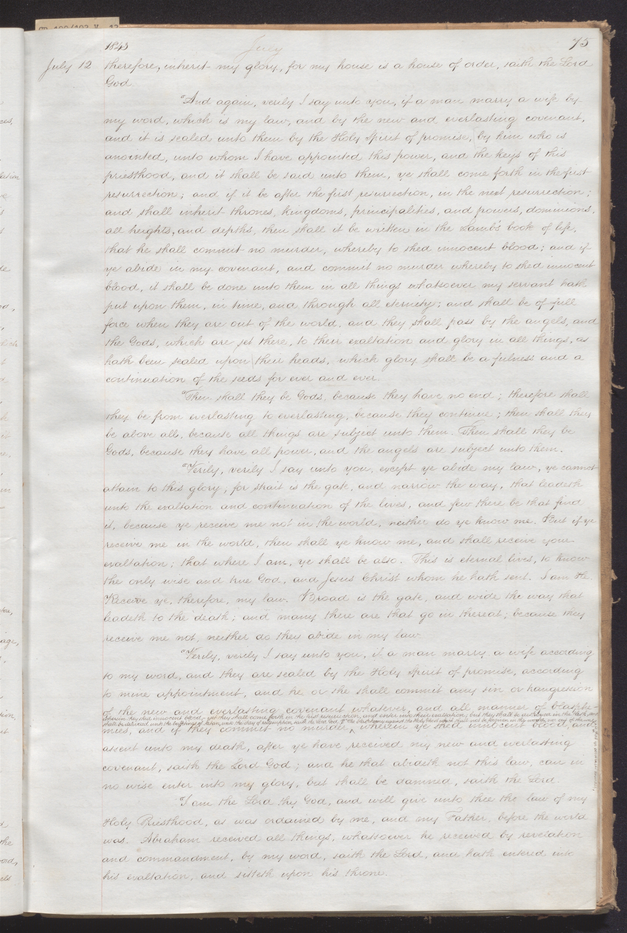 JS, History, 1838–1856, vol. E-2, created 18 Apr.–6 Aug. 1856; handwriting of ; 83 pages; CHL. This is a first part of a copy of the fifth volume of a six-volume manuscript history of the church (JS History, 1838–1856, vol. E-1), and covers the period from 1 to 19 July 1843. The copy also comprises four other volumes, labeled A-2, B-2, C-2, and D-2, and continues through 19 July 1843. The copy was discontinued 6 Aug. 1856 “by the advice of President ” (JS History, 1838–1856, vol. E-2, p. 83).