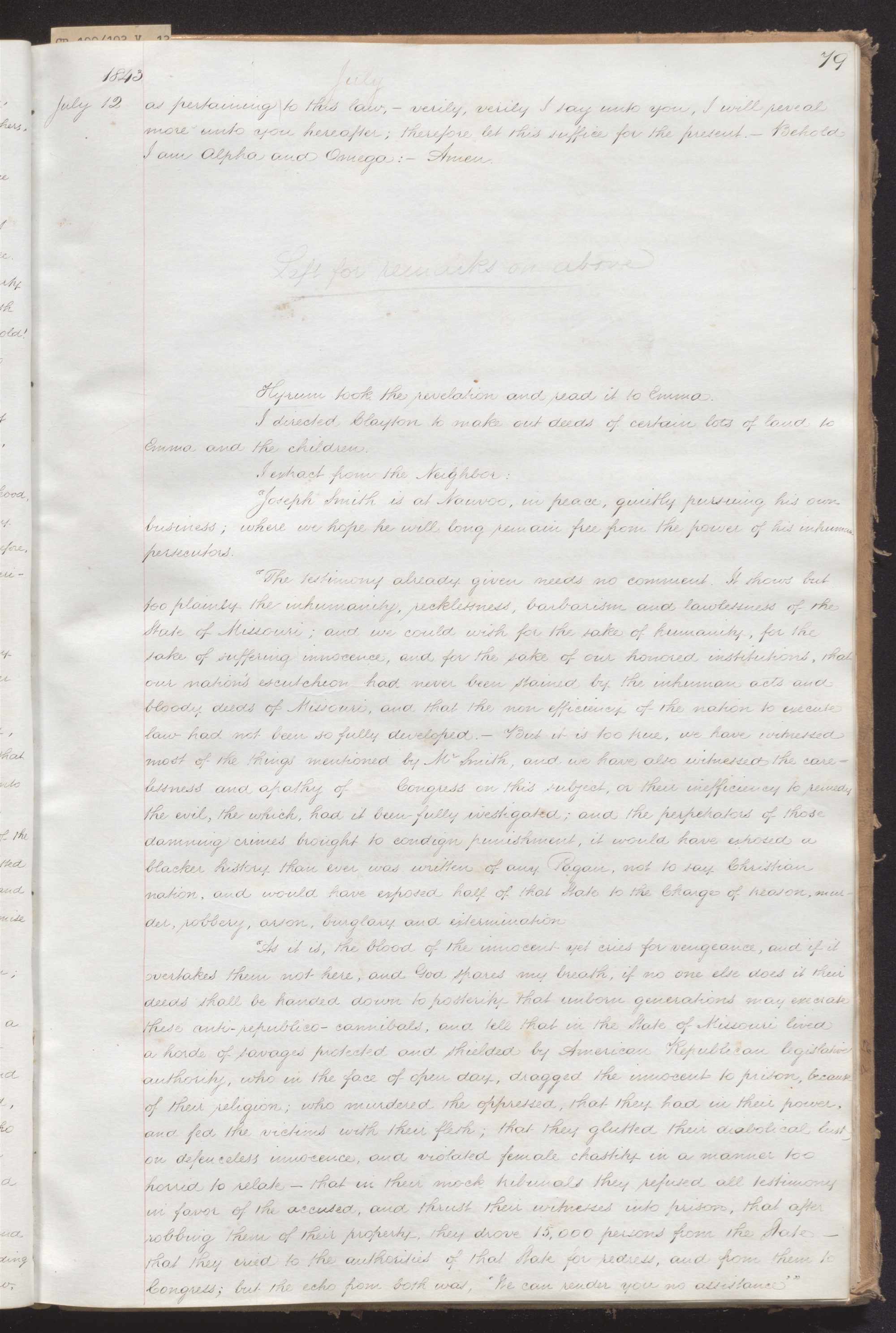 JS, History, 1838–1856, vol. E-2, created 18 Apr.–6 Aug. 1856; handwriting of ; 83 pages; CHL. This is a first part of a copy of the fifth volume of a six-volume manuscript history of the church (JS History, 1838–1856, vol. E-1), and covers the period from 1 to 19 July 1843. The copy also comprises four other volumes, labeled A-2, B-2, C-2, and D-2, and continues through 19 July 1843. The copy was discontinued 6 Aug. 1856 “by the advice of President ” (JS History, 1838–1856, vol. E-2, p. 83).