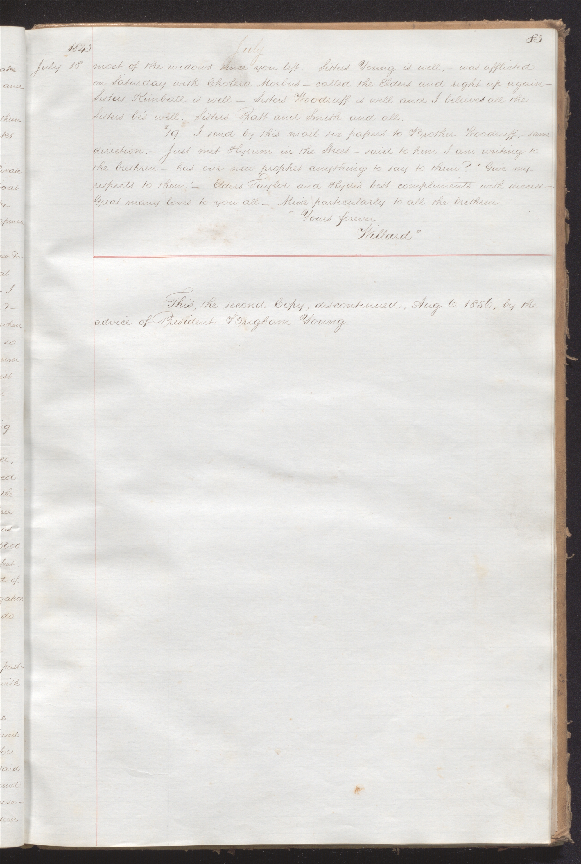 JS, History, 1838–1856, vol. E-2, created 18 Apr.–6 Aug. 1856; handwriting of ; 83 pages; CHL. This is a first part of a copy of the fifth volume of a six-volume manuscript history of the church (JS History, 1838–1856, vol. E-1), and covers the period from 1 to 19 July 1843. The copy also comprises four other volumes, labeled A-2, B-2, C-2, and D-2, and continues through 19 July 1843. The copy was discontinued 6 Aug. 1856 “by the advice of President ” (JS History, 1838–1856, vol. E-2, p. 83).
