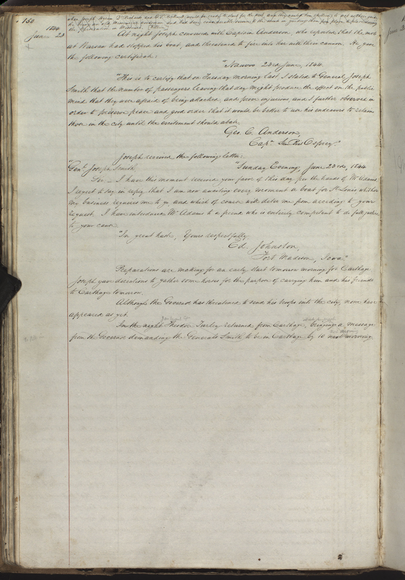 assumed the role of scribe on 20 August 1856. (Historian’s Office, Journal, 20 Aug. 1856.) He incorporated ’s draft notes for the period 24–29 June 1844 on pages 151–189, providing an account of JS’s death and its immediate aftermath. He next transcribed a related extract from ’s 1854 History of Illinois on pages 190–204. Pages 205–227 were left blank.