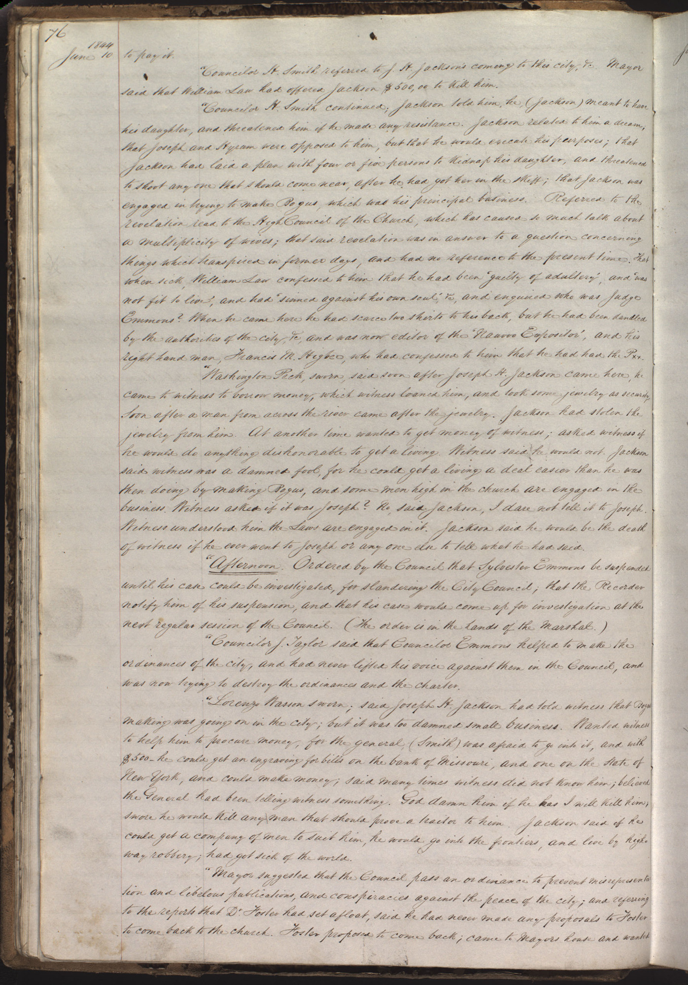 “Mayor suggested that the Council pass an ordinance to prevent misrepresentation and libelous publications, and conspiracies against the peace of the ; and referring to the reports that had set afloat, said he never made any proposals to to come back to the church. proposed to come back; came to Mayors house and wanted [p. 76]