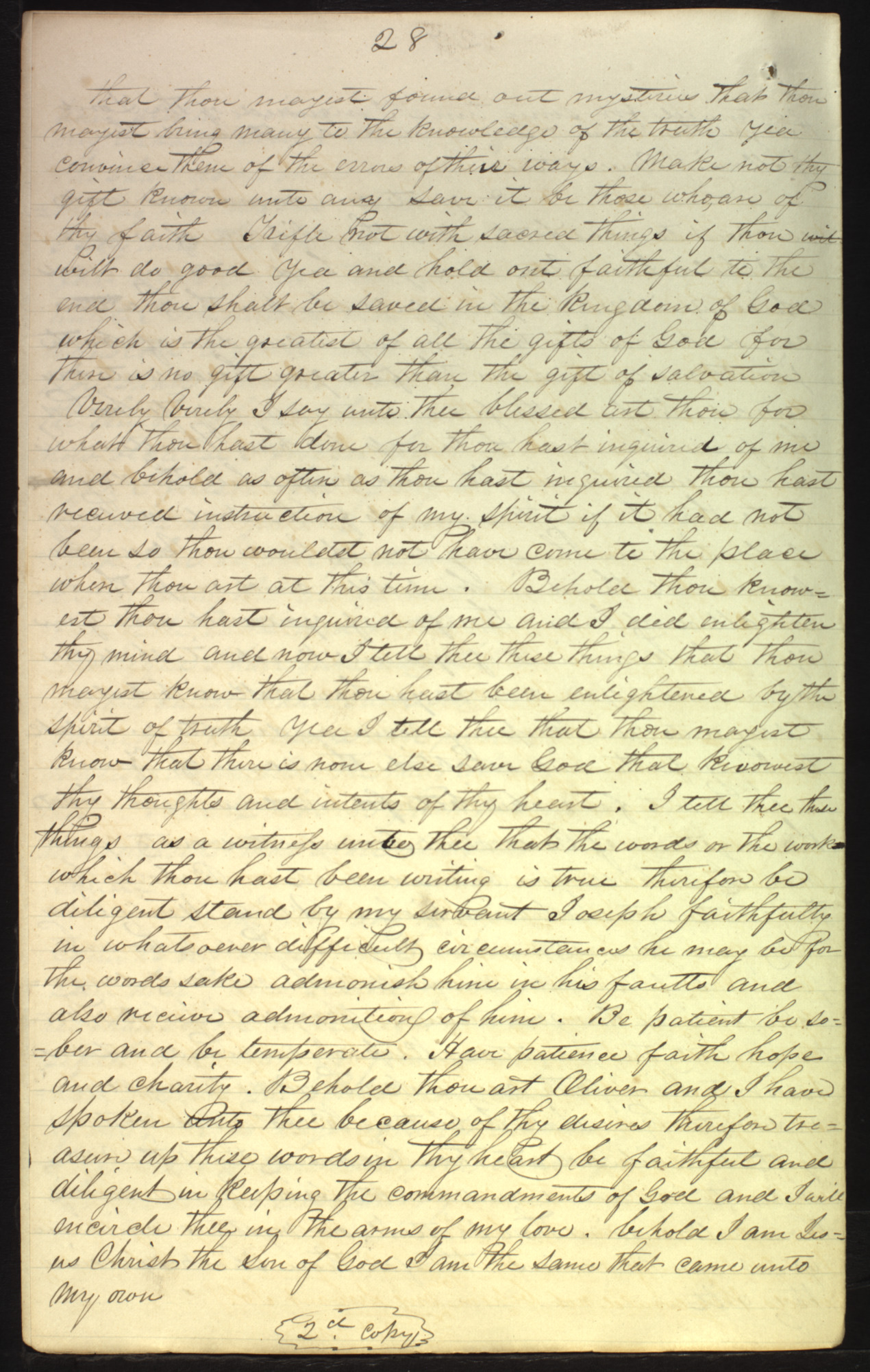 Verily Verily I say unto thee blessed art thou for what thou hast done for thou hast inquired of me and behold as often as thou hast inquired thou hast received instruction of my spirit if it had not been so thou wouldst not have come to the place where thou art at this time. Behold thou knowest thou hast inquired of me and I did enlighten thy mind and now I tell thee these things that thou mayest know that thou hast been enlightened by the spirit of truth Yea I tell thee that thou mayest know that there is none else save God that knowest thy thoughts and intents of thy heart. I tell thee these things as a witness unto thee that the words or the works which thou hast been writing is true therefore be diligent stand by my servant Joseph faithfully in whatsoever difficult circumstances he may be for the words sake admonish him in his faults and also recieve admonition of him. Be patient be sober and be temperate. Have patience faith hope and charity. Behold thou art and I have spoken unto thee because of thy desires therefore treasure up these words in thy heart be faithful and diligent in keeping the commandments of God and I will encircle thee in the arms of my love. behold I am Jesus Christ the Son of God I am the same that came unto my own [p. 28]