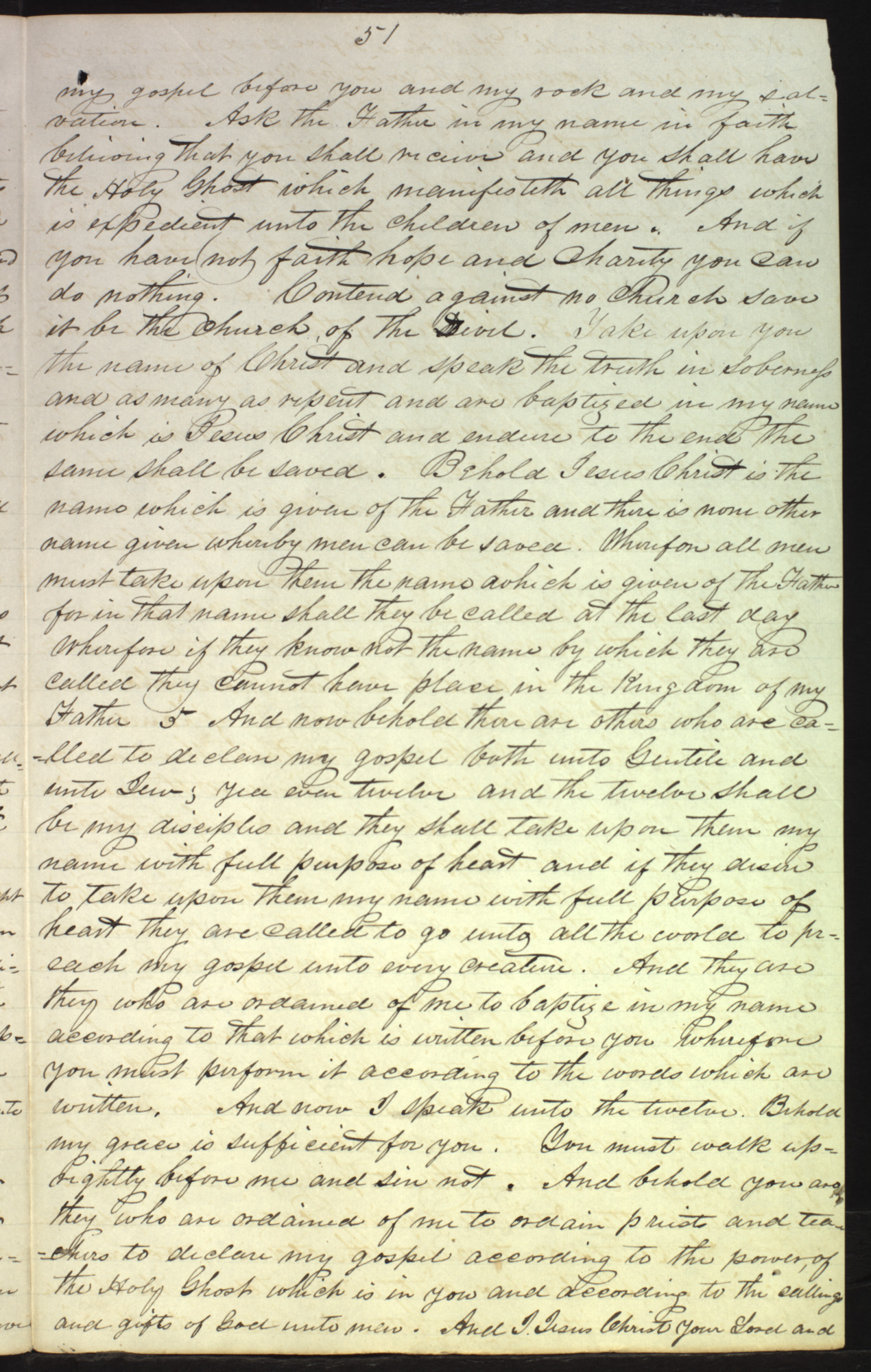 my gospel before you and my rock and my salvation. Ask the Father in my name in faith believing that you shall receive and you shall have the Holy Ghost which manifesteth all things which is expedient unto the children of men. And if you have not faith hope and charity you can do nothing. Contend against no church save it be the church of the Devil. Take upon you the name of Christ and speak the truth in soberness and as many as repent and are baptized in my name which is Jesus Christ and endure to the end the same shall be saved. Behold Jesus Christ is the name which is given of the Father and there is none other name given whereby men can be saved. Wherefore all men must take upon them the name which is given of the Father for in that name shall they be called at the last day wherefore if they know not the name by which they are called they cannot have place in the Kingdom of my Father 5 And now behold there are others who are called to declare my gospel both unto Gentile and unto Jew; yea even twelve and the twelve shall be my disciples and they shall take upon them my name with full purpose of heart and if they desire to take upon them my name with full purpose of heart they are called to go unto all the world to preach my gospel unto every creature. And they are they who are ordained of me to baptize in my name according to that which is written before you wherefore you must perform it according to the words which are written. And now I speak unto the twelve. Behold my grace is sufficient for you. You must walk uprightly before me and sin not. And behold you are they who are ordained of me to ordain priests and teachers to declare my gospel according to the power of the Holy Ghost which is in you and according to the calling and gifts of God unto men. And I Jesus Christ your Lord and [p. 51]