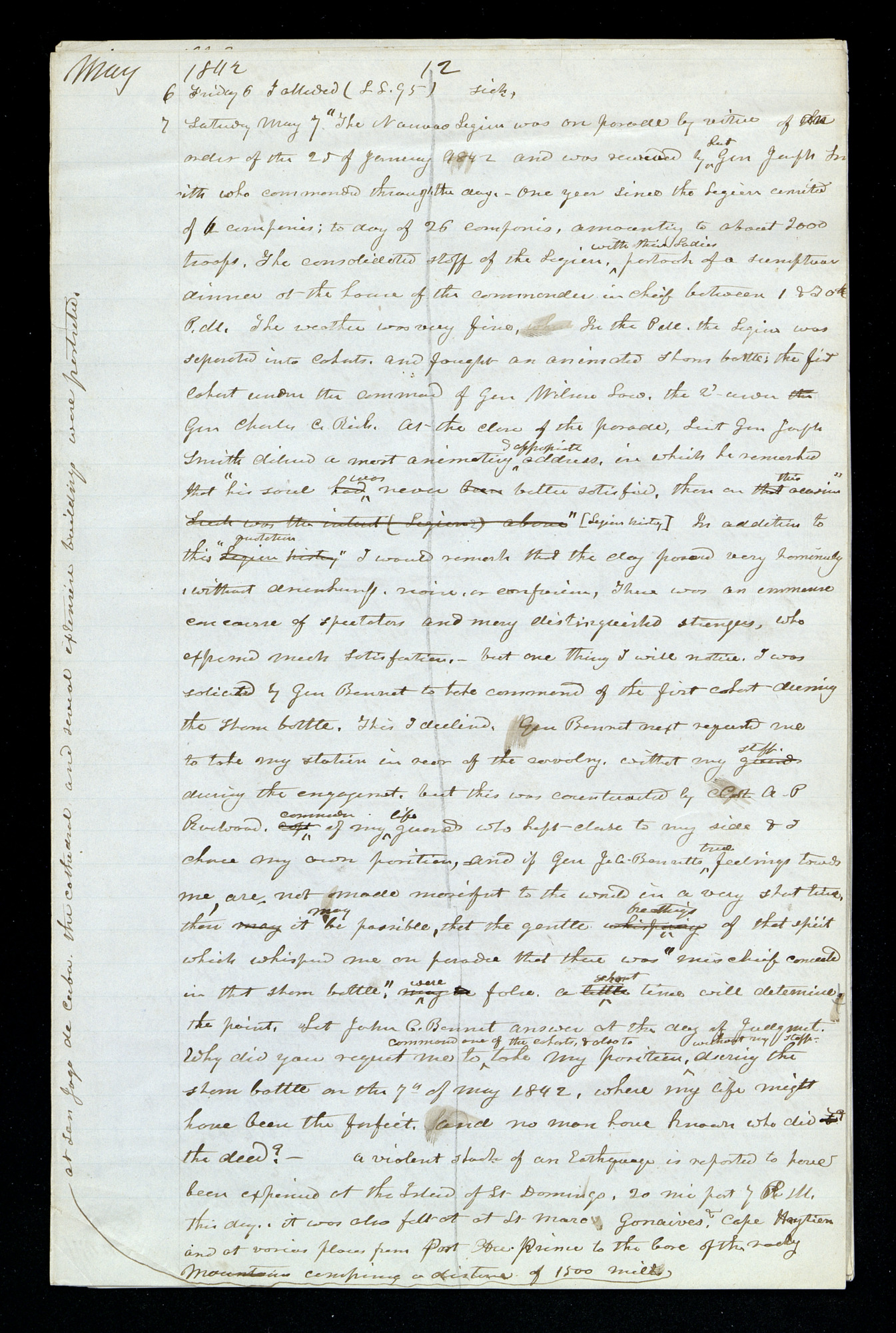 <7> Satuday May 7. “The was on parade by vi[r]tue of the an order of the 25 of January last 1842 and was reviewed by <Leit> Gen Joseph Smith who commanded through the day,— one year since the Legion consited of 2 6 companies; to day of 26 companis, amounting to about 2000 troops. The consolidated staff of the Legion, <with their Ladies> partook of a sumptuous dinner at the house of the commander in Chief between 1 & 3 ok P.M. The weather was very fine, which In the PM. the Legion was seperated into Cohorts, and fought an animated Sham battle; the fi[r]st Cohort under the command of Gen , the 2d under the Gen . At the close of the parade, Lieut Gen Josph Smith delivered a most animating <& appopiate> address, in which he remarked that “his soul had <was> never been better satisfied, than on that <this> occasion” Such was the intent (Legion 2) above” (Legion history) In addition to this “Legion history” <“quotation”> I would remark that the day passed very harminisly without drunkeness, noise, or confusion, There was an emmense concourse of Spectators and many distinguished strangers, who expessed much satisfation,— but one thing I will notice. I was solicited by to take command of the fir[s]t cohort during the Sham battle. This I declined. next requested me to take my statien in rear of the cavolry, without my guard Staff, during the engagemet, but this was counteracted by Capt. Col. , Capt <Commander> of my <life> guards who kept close to my side & I chose my own position, and if Gen <true> feelings towds me, are not made manifest to the world in a very sho[r]t time, then may it <may> be possible, that the gentle whisperings <breathings> of that spi[r]it which whispered me on paradee that there was “mischief concealed in that Sham battle,” may be <were> false. A little <short> time will determine the point. Let answer at the day of Judgme[n]t. Why did you reque[s]t me to <command one of the cohorts, & also to> take my position <without my staff— >, during the sham battle on the 7thof May 1842, where my life might have been the forfeit, and no man have known who did it? the deed?—