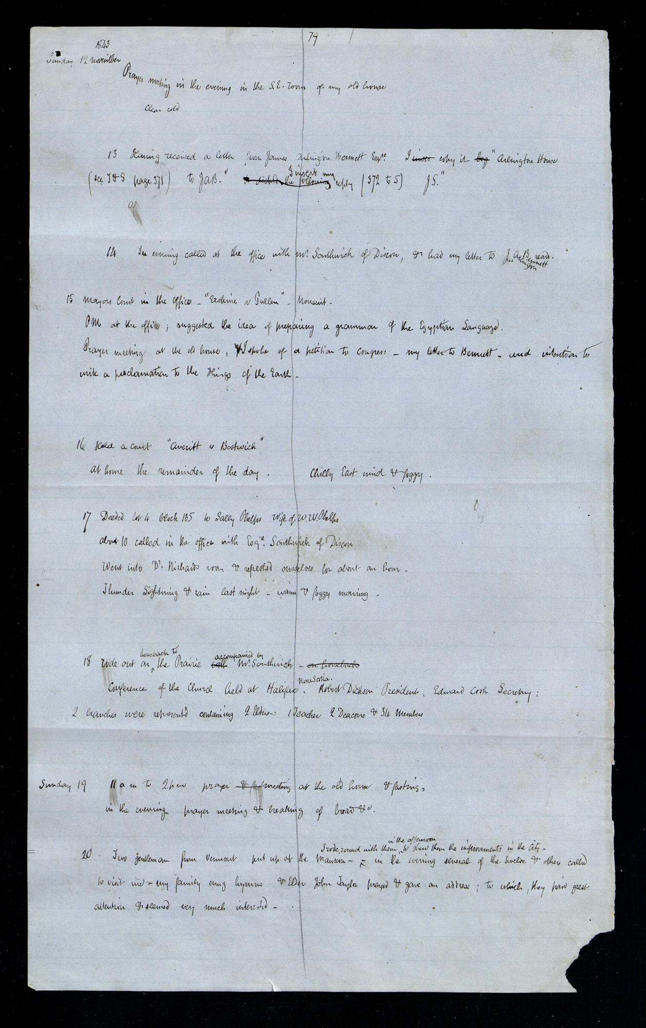 <20> Two gentleman from put up at the — <I rode round with them <in the afternoon> to shew them the inprovements in the —> in the evening several of the & others called to visit me— my family sung hymns & prayed & gave an address; to which, they paid great attention & seemed very much interested— [p. 79]