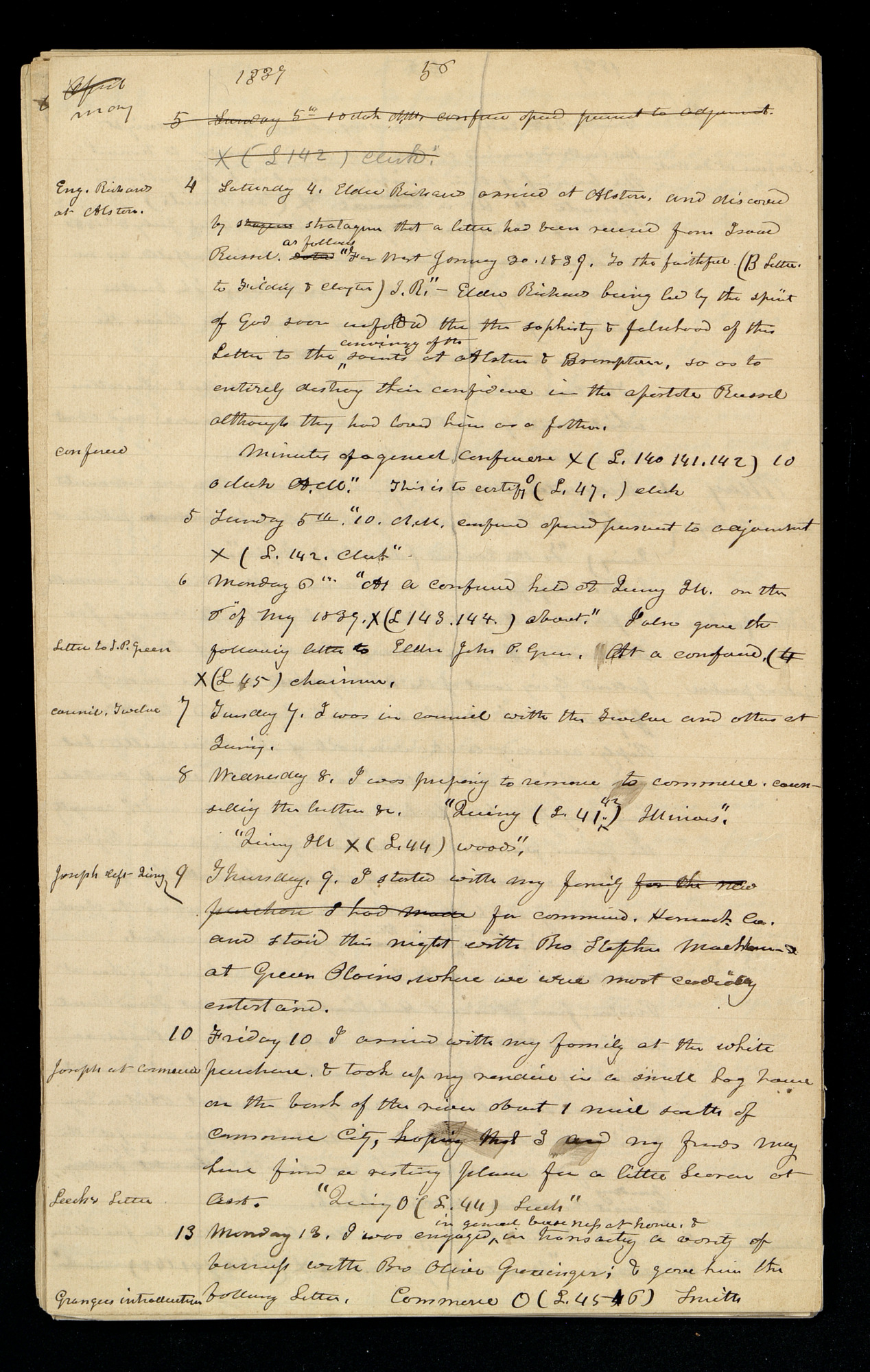 <6> Monday 6[th]. “At a held at Ill. on the 6[th] of M[a]y 1839. X (L 143. 144.) about.” I also gave the <Letter to > followi[n]g letter to . At a confere[n]ce, (4 X (L 45) chairm[a]n.