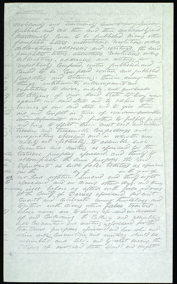 instructions, resolution, orders, declarations adresses, and writings and and their said false maliciously and traitorously cause to be published publish. and did then and there maliciously and traitorously cause to be published divers other pamphlets, letters, instructions, resolutions, orders declarations, addresses and writings, the said pamphlets, letters, instructions, resolutions, orders declarations, addresses, and writings so respectively composed, writen published, and Caused to be composed writen, and published purporting and containing, therein, among other things, incitments, encouragements, and exortations to move, induce, and pursuade the Citizens of our said to levy war against our said and to adhere to the enemies of our said and to give them aid and comfort in time of war— and the said defendants and further to fulfill, perfect and bring to effect their most evil and wicked treason and treasonable compassings and imaginations aforesaid and in order the more readily and efectually to assemble such Convention and meeting as aforesaid for the tratorous purposes aforesaid, and thereby to accomplish the same purposes. the said Defendants as such false traitors as aforesaid on the [blank] day of [blank] in the year of our Lord eighteen hundred and thirty eight aforesaid and on divers other days. and times as well before as after with force and arms at the County of aforesaid did meet Consult and deliberate among themselves. and together with divers other false traitors whose names are to Jurors aforesaid unknown of and concerning the Calling and assembling such Convention and meeting. as aforesaid for the traitorous purposes aforesaid and how when and where such Convention and meeting should be assembled and held— and by what means, the Citizens of our said should and might [p. 3]