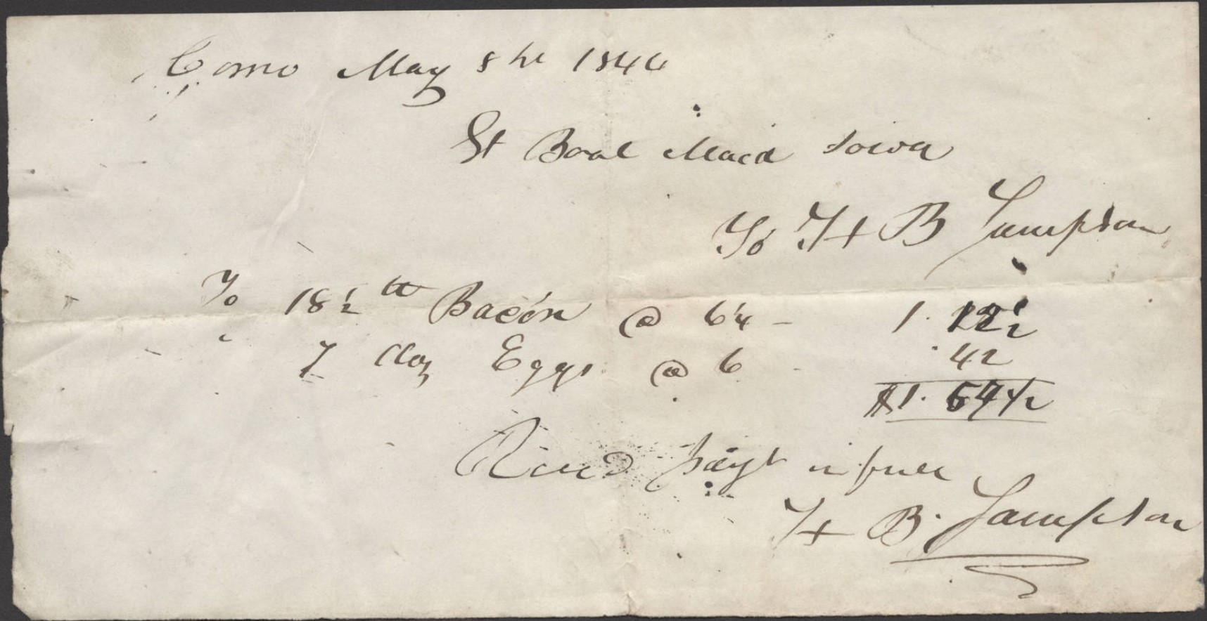 Henry B. Sampson, Invoice and Receipt, Como, Whiteside Co., IL, to Maid of Iowa, [, Hancock Co., IL], 8 May 1844; handwriting presumably of Henry B. Sampson; one page; Newel K. Whitney Collection, BYU. Includes archival notation.