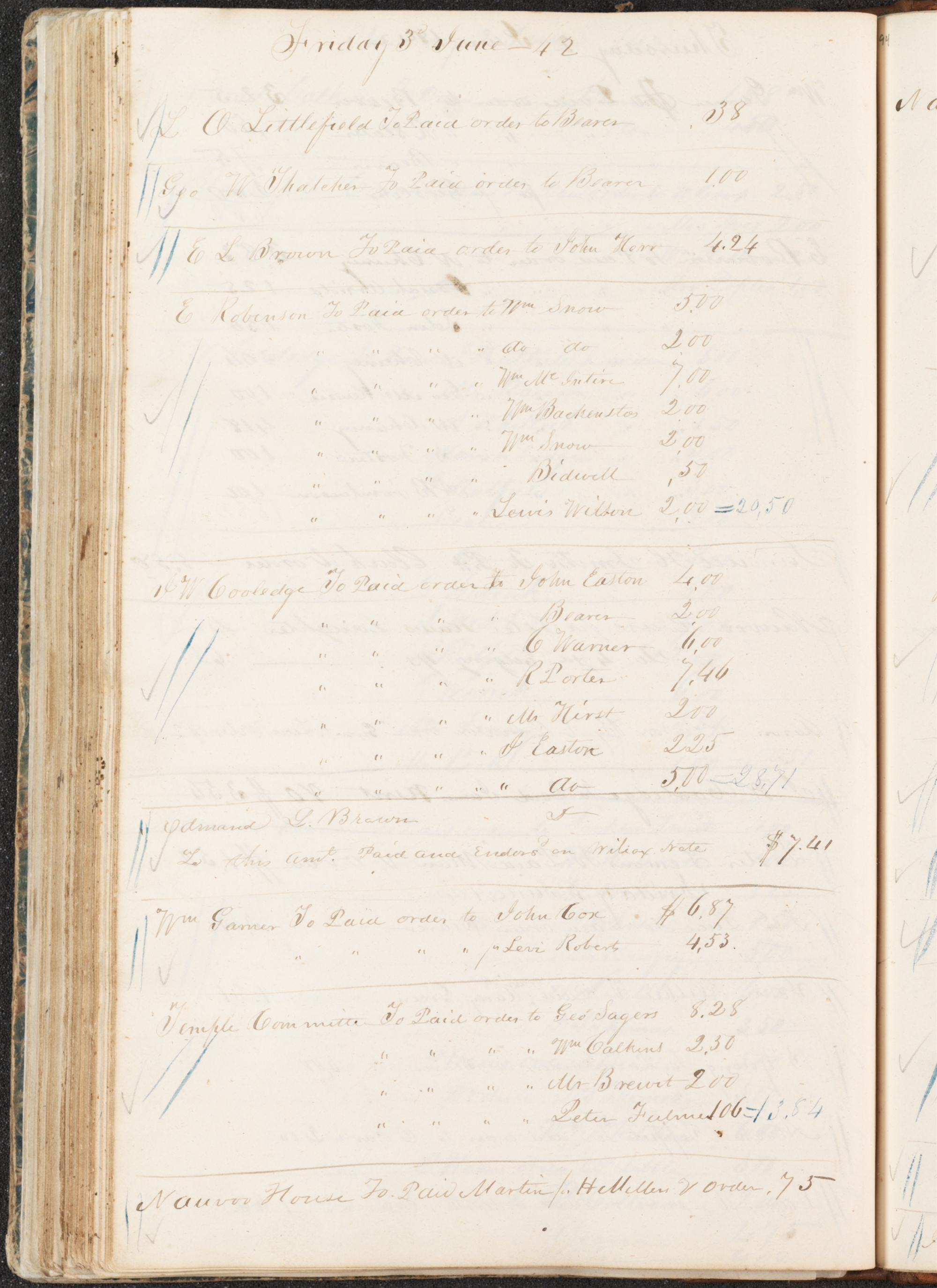 Daybook A, featured here, contains 315 pages of chronological entries for transactions at the store from 12 January to 13 July 1842. During this period, clerks and kept most of the store records, while younger clerks and occasionally wrote entries in the daybook as well. The clerks often used abbreviations, many of which were commonplace in the nineteenth century, such as placing a forward slash or line through the abbreviation for pounds (lb) or using the symbol @ to specify the cost of an individual item, for example “10 lbs of sugar @ 12 cents.” Other less common abbreviations also appear in this record. Clerks wrote “V.O.” to stand for “verbal order,” or a verbal promise to repay a debt, and they recorded the receipt of a written promise for repayment, or pay order, simply as “order.” Both kinds of orders were recognized as a form of payment in the daybooks. In a community like , with little currency, these verbal or written promises for repayment helped fill the ciruclation void.