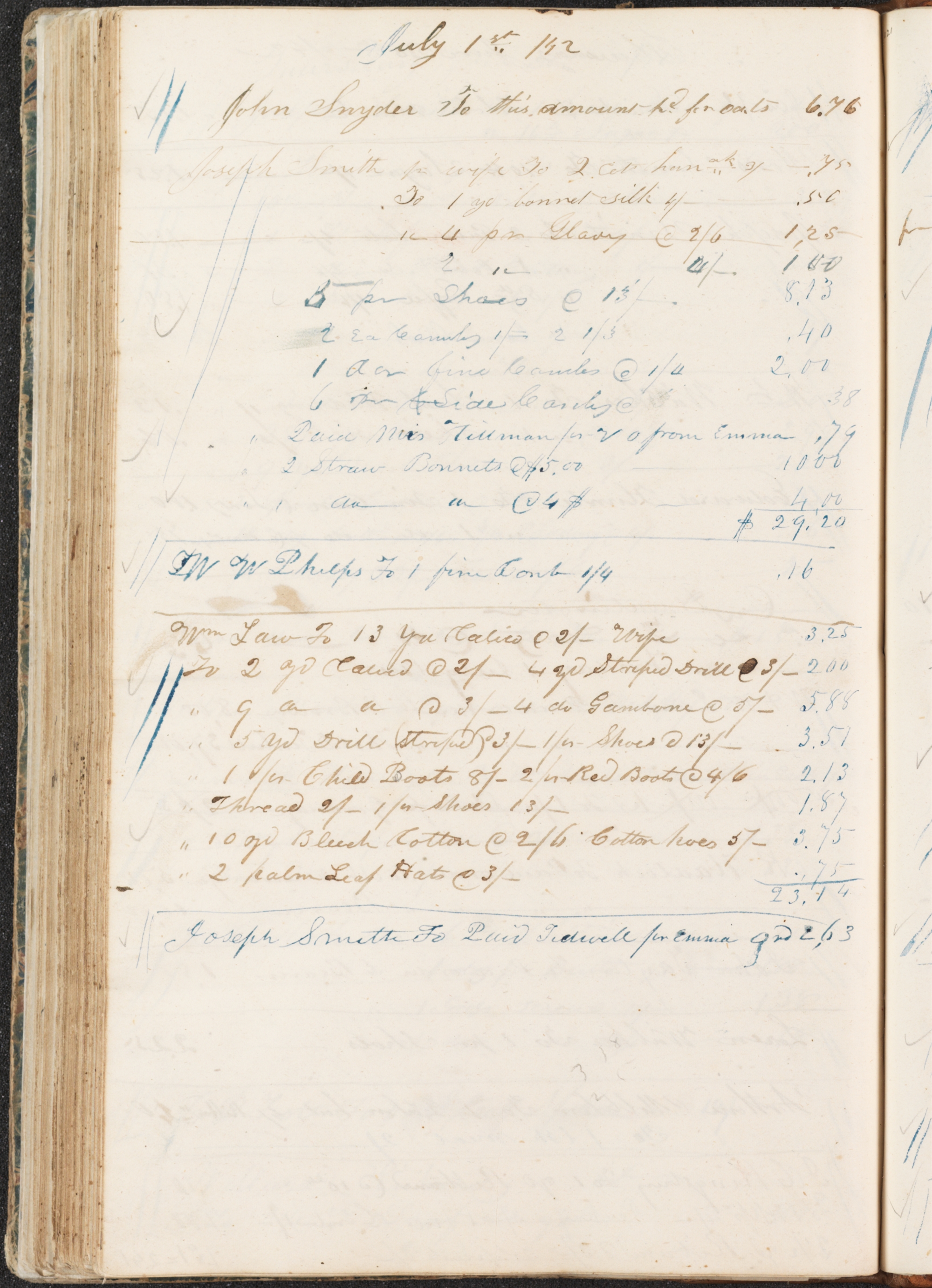 Daybook A was used in the store until July 1842. After JS’s death it appears to have been in the possession of JS’s immediate family, and at some point, it was given to JS’s adopted daughter, . After she died, the Moffitt family, who were caring for Middleton at the end of her life, retained it. Ida E. Moffitt sent the daybook to Julia’s niece Julia P. Murdock Farnsworth in November 1926. Julia Farnsworth donated it to the Historian’s Office in February 1927.