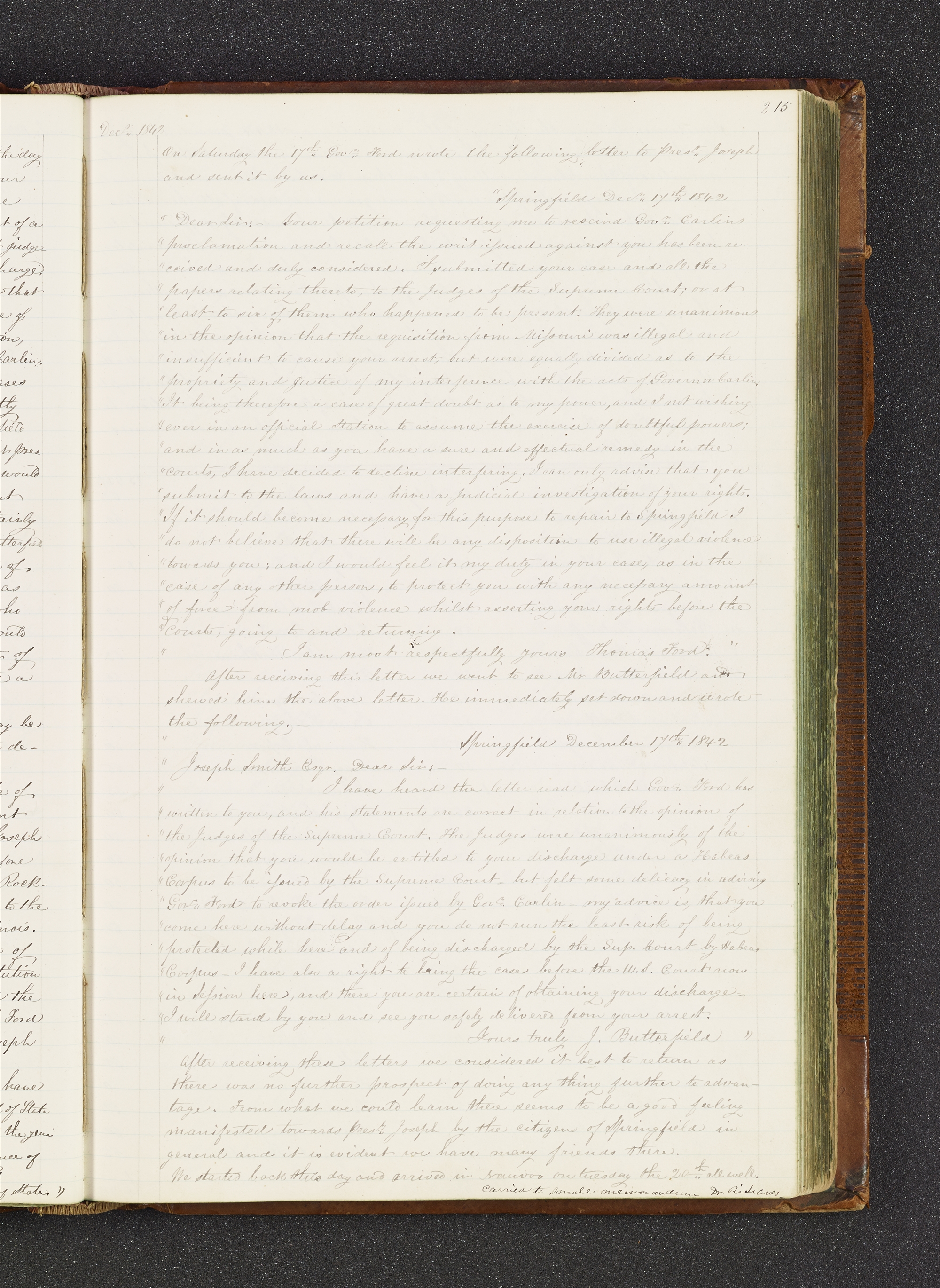JS went to Springfield in the last week of December. By the first week of January, Butterfield determined that the federal court was the appropriate venue for this habeas corpus hearing, as it involved the constitutional issue of whether JS could be tried for a crime in Missouri when he had not fled from that state to avoid justice. (JS, Journal, 4 Jan. 1843.)