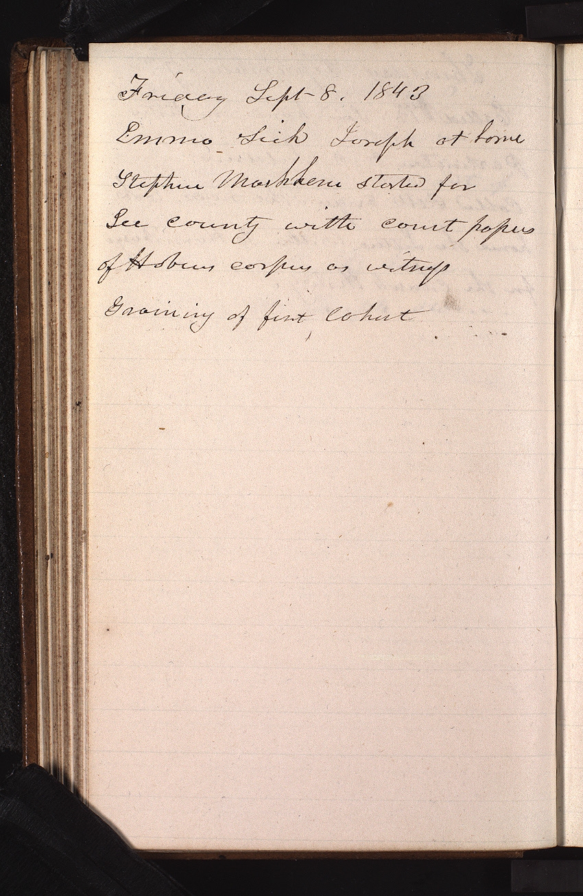 Markham was on his way to attend the September term of the Lee County, Illinois, circuit court for an upcoming case involving JS; the papers he carried with him may have been generated in connection with JS’s habeas corpus hearing before the Nauvoo Municipal Court on 1 July 1843. The case to be heard in Lee County, JS v. Joseph H. Reynolds and Harmon T. Wilson, was initiated following JS’s arrest in Dixon in June 1843, when JS swore an affidavit against the arresting officers, Wilson and Reynolds, claiming damages of ten thousand dollars. Markham, who had been with JS at the time of his arrest, returned to Nauvoo and reported on the case on 23 September 1843. (JS, Journal, 1 July 1843; Nauvoo Municipal Court Docket Book, 55–87, 116–150; JS, Affidavit, 24 June 1843, copy, JS Collection, CHL; Shepherd Patrick, Declaration, [ca. 24 June 1843], copy; Shepherd Patrick, Praecipe for Summons, 25 June 1843, copy, JS Collection, CHL; JS, Journal, 23 June and 23 Sept. 1843.)