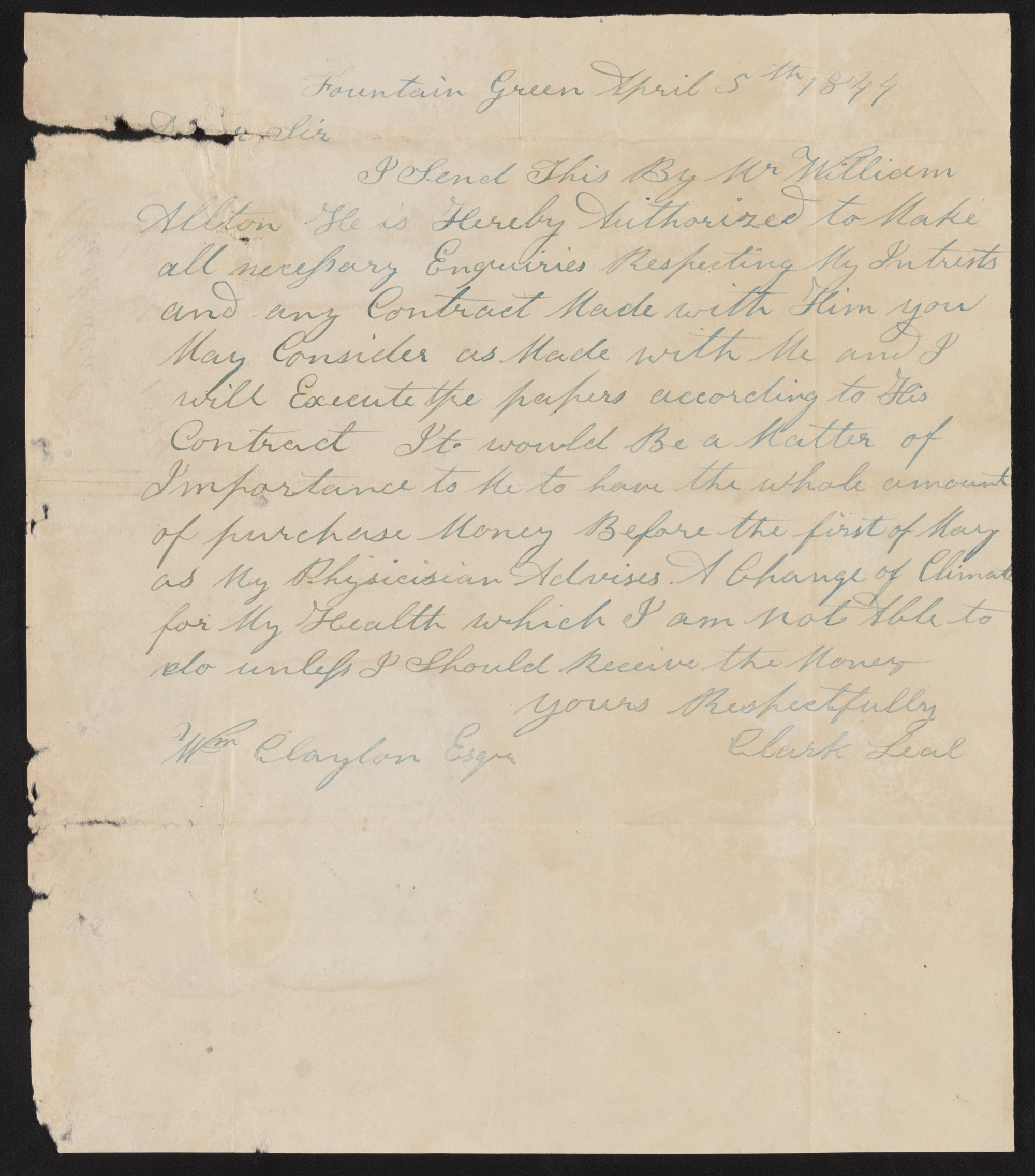 I Send This By Mr William Allton He is Hereby Authorized to Make all necessary Enquiries Respecting My Intrests and any Contract Made with Him you May Consider as Made with Me and I will Execute the papers according to His Contract It would Be a Matter of Importance to Me to have the whole amount of purchase Money Before the first of May as My Physicisian Advises A Change of Climate for My Health which I am not Able to do unless I Should Receive the Money