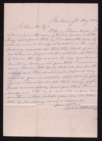 Although this letter and others that Hotchkiss wrote to his business partners and to JS had either a return address or postmark of Fair Haven, Connecticut, Hotchkiss’s residence was a mile or two away in New Haven. (See Bond from Horace Hotchkiss, 12 Aug. 1839–A; and Bond from Horace Hotchkiss, 12 Aug. 1839–B.)