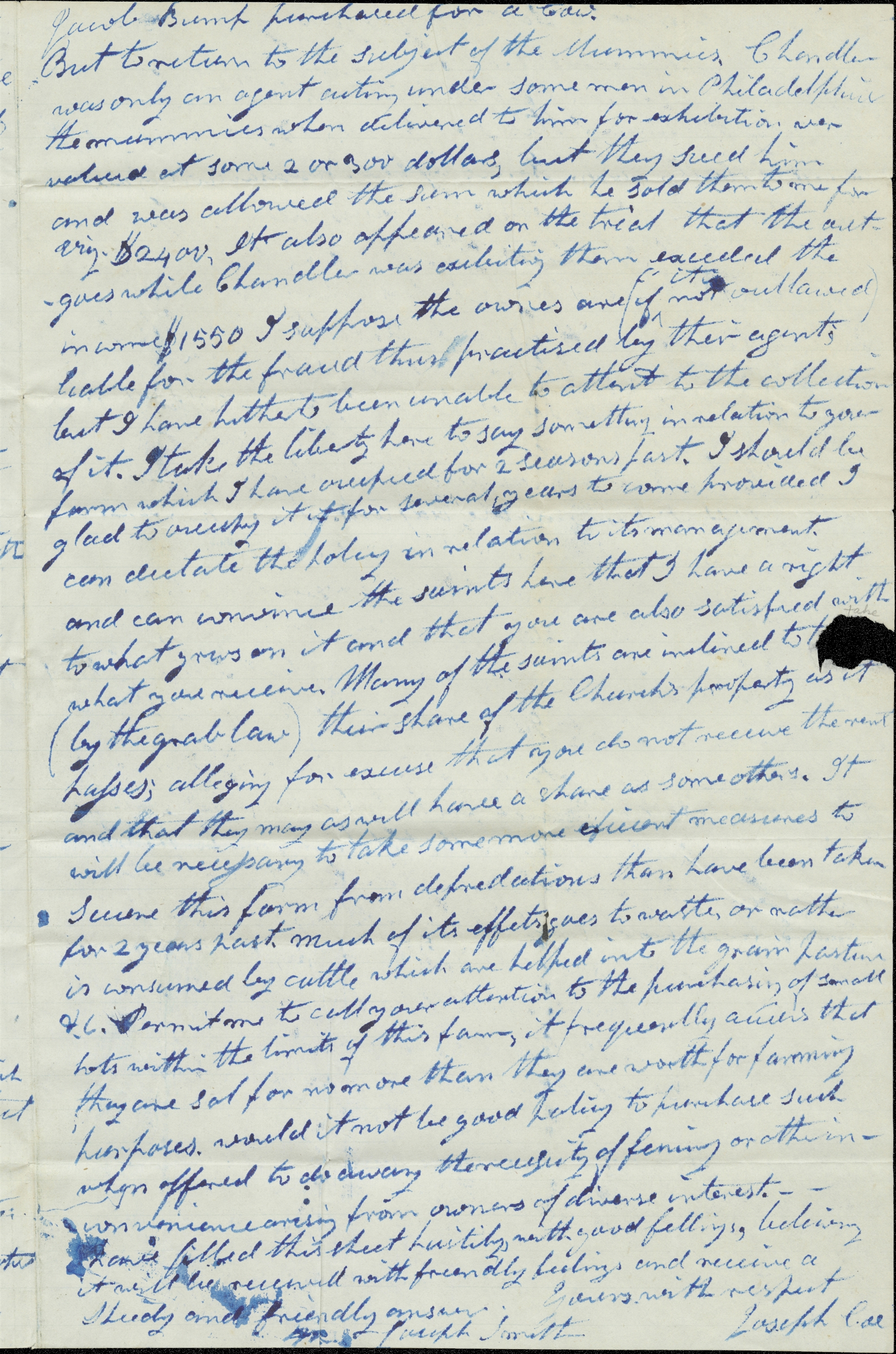 On the same day Coe wrote this letter, church agent Reuben McBride wrote to JS that “there is a number here who believe because they belong to the Ch[urch] that they own a share of the farm they throw down fences and cut timber and burn rails turn their cattle into the Lots &c.” (Letter from Reuben McBride, 1 Jan. 1844.)