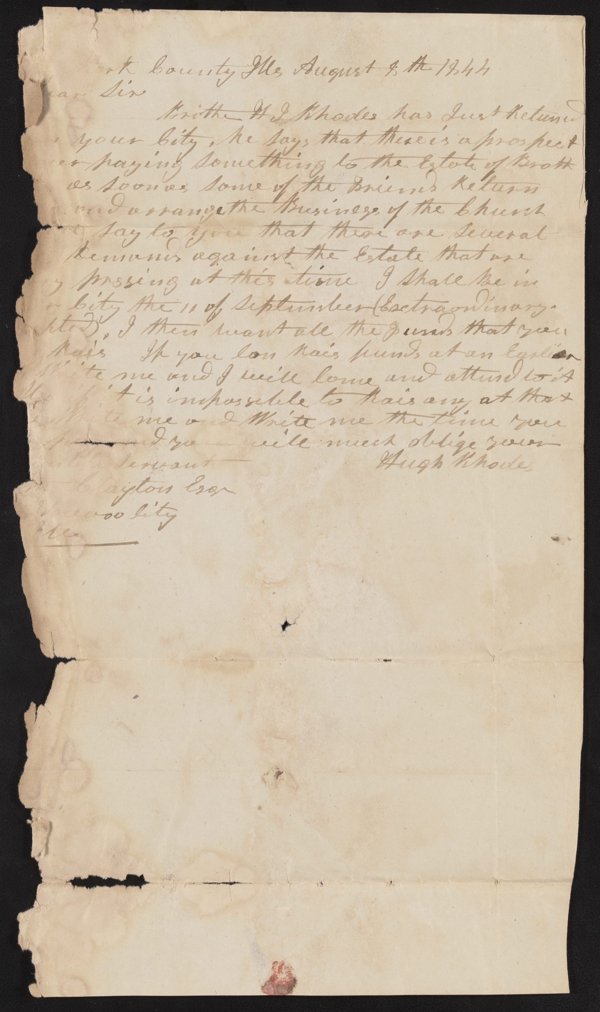 Brother H J Rhodes has Just Retuned [illegible] your City. he says that there is a prospect [illegible]er paying something to the Estate of Broth[er] [illegible] as soon as some of the Friends Return [illegible] and arrange the Business of the Church [illegible] say to you that there are several [illegible] Demands against the Estate that are [ve]ry prssing at this time I shall Be in [you]r City the 11 of September (Extraordinary [exc]epted). I then want all the funds that you [can] Rais If you can Rais funds at an Earlier [illegible] Write me and I will come and attend to it Also if it is impossible to Rais any at that [tim]e Write me and Write me the time you [illegible] pay and yo[u] will much oblige your [H]umble Servant
