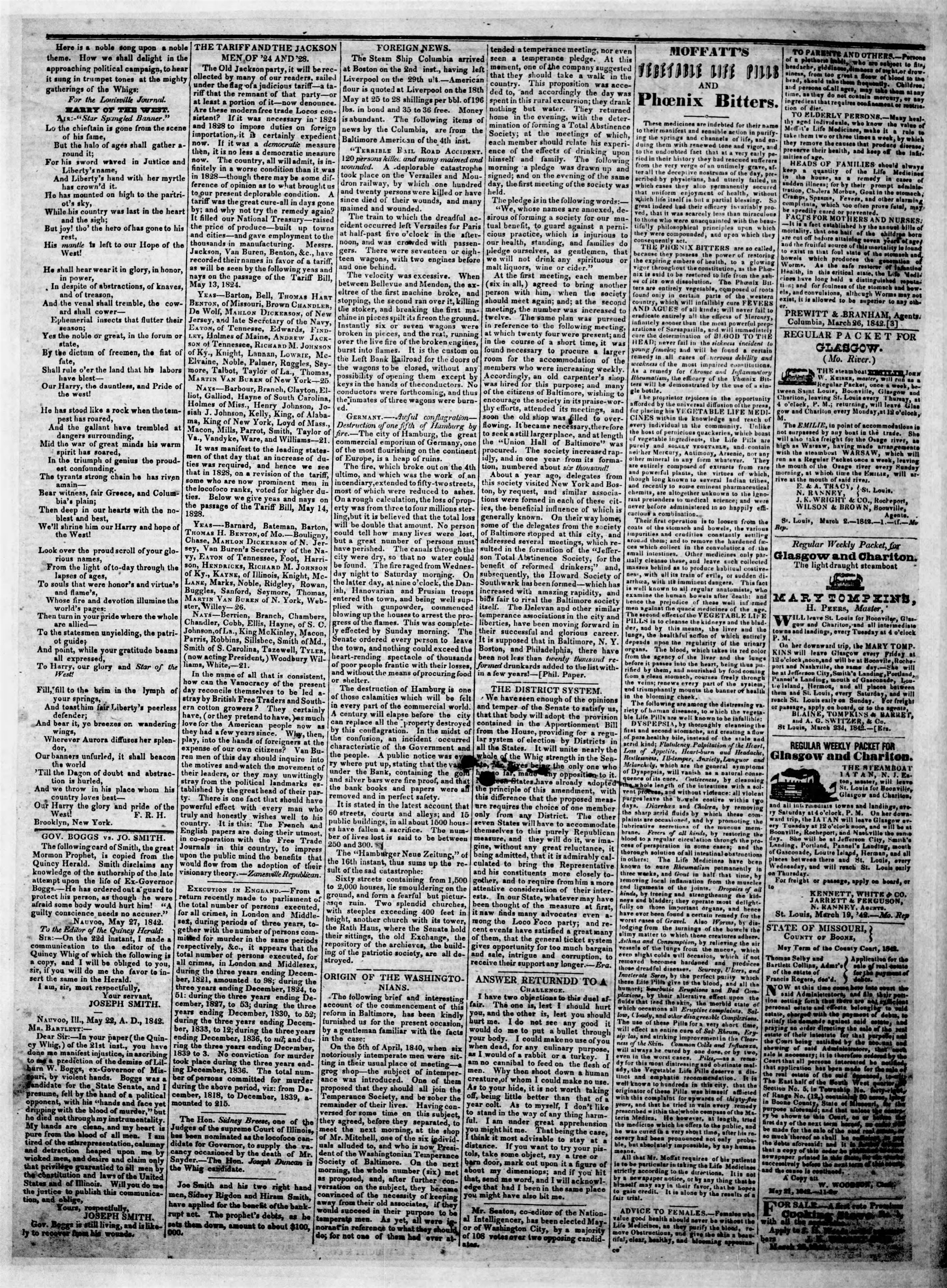 JS, Letter, , Hancock Co., IL, to the editor of the Quincy Herald [], , Adams Co., IL, 27 May 1842. Version published in Columbia (MO) Herald-Statesman, 25 June 1842, vol 7, no. 16, p. [4]. Transcription from a digital image obtained from Newspapers.com in 2025.
