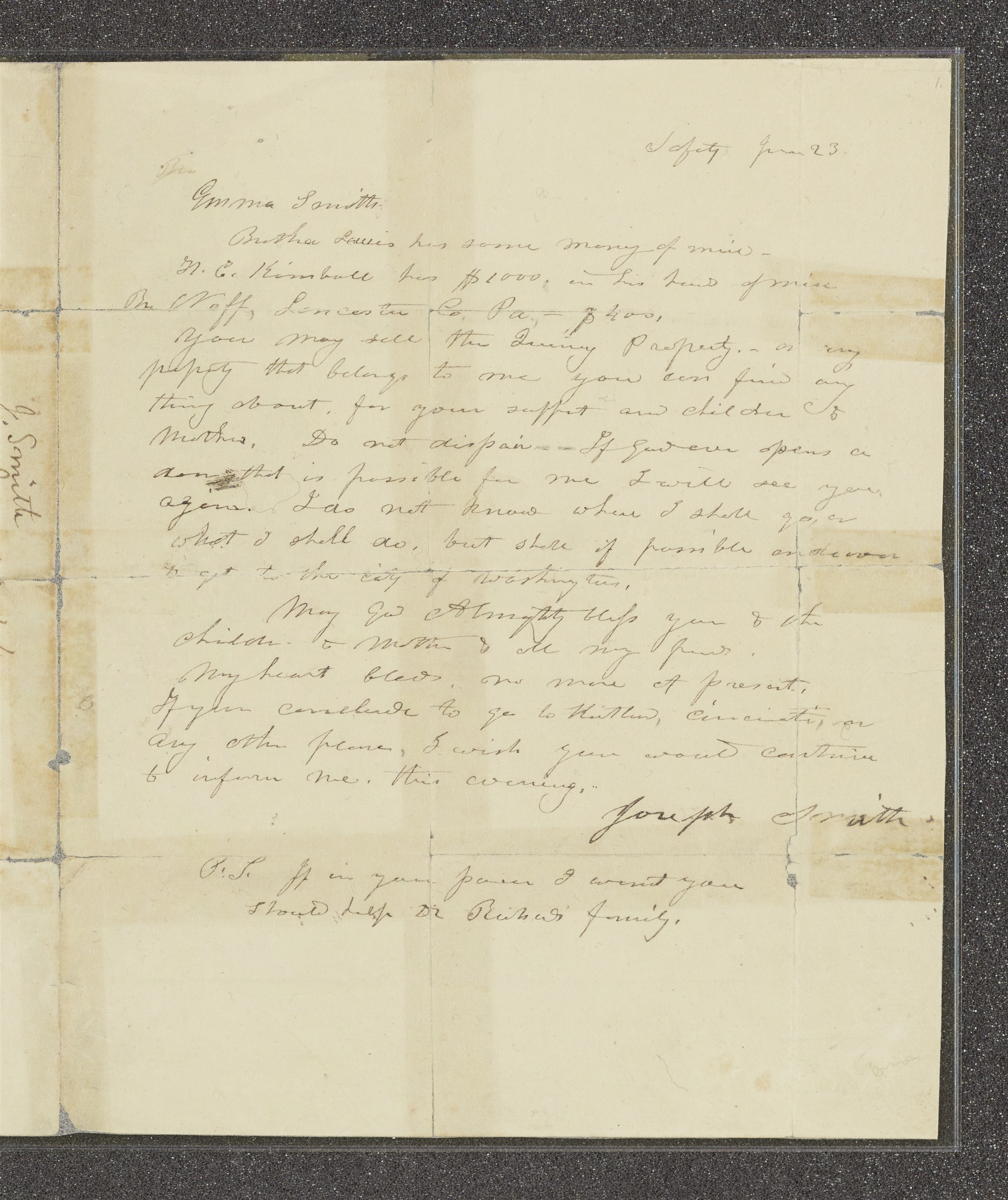 JS, Letter, “Safety” [], to , , Hancock Co., IL, 23 June 1844; handwriting of ; signature of JS; dockets in handwriting of and unidentified scribe; one page; CHL.