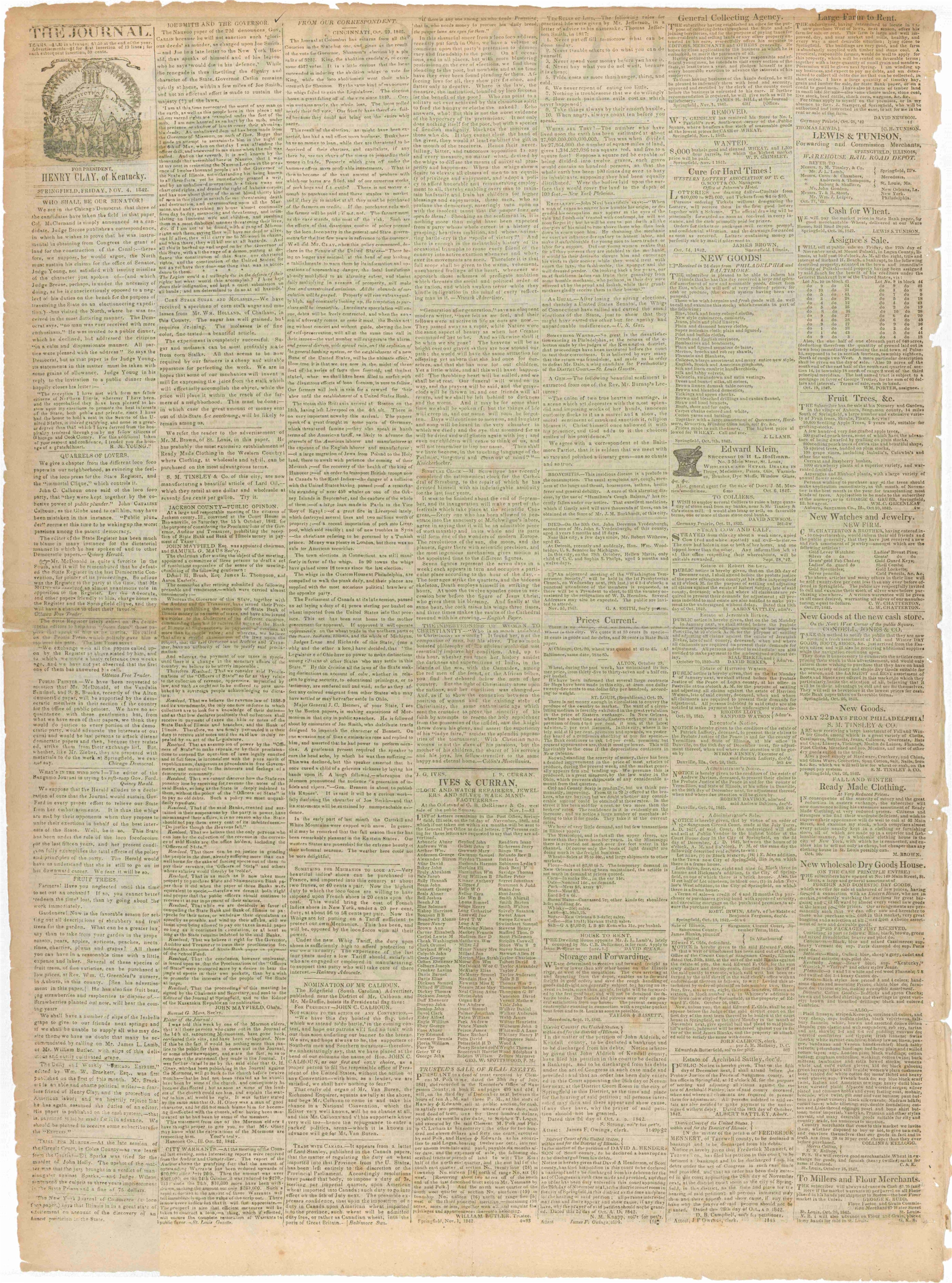 JS, Letter, , Hancock Co., IL, to , , [New Utrecht, Kings Co., NY], 8 Sept. 1842. Extract published in “Joe Smith and the Governor,” Sangamo Journal (Springfield, IL), 4 Nov. 1842, vol. 12, no. 1, [2]. Transcription from a digital color image obtained from the Illinois Digital Newspaper Collections, University of Illinois at Urbana-Champaign, in 2022, idnc.library.illinois.edu. For more complete source information, see the source note for Notice to Creditors and Others, 17 June 1842.