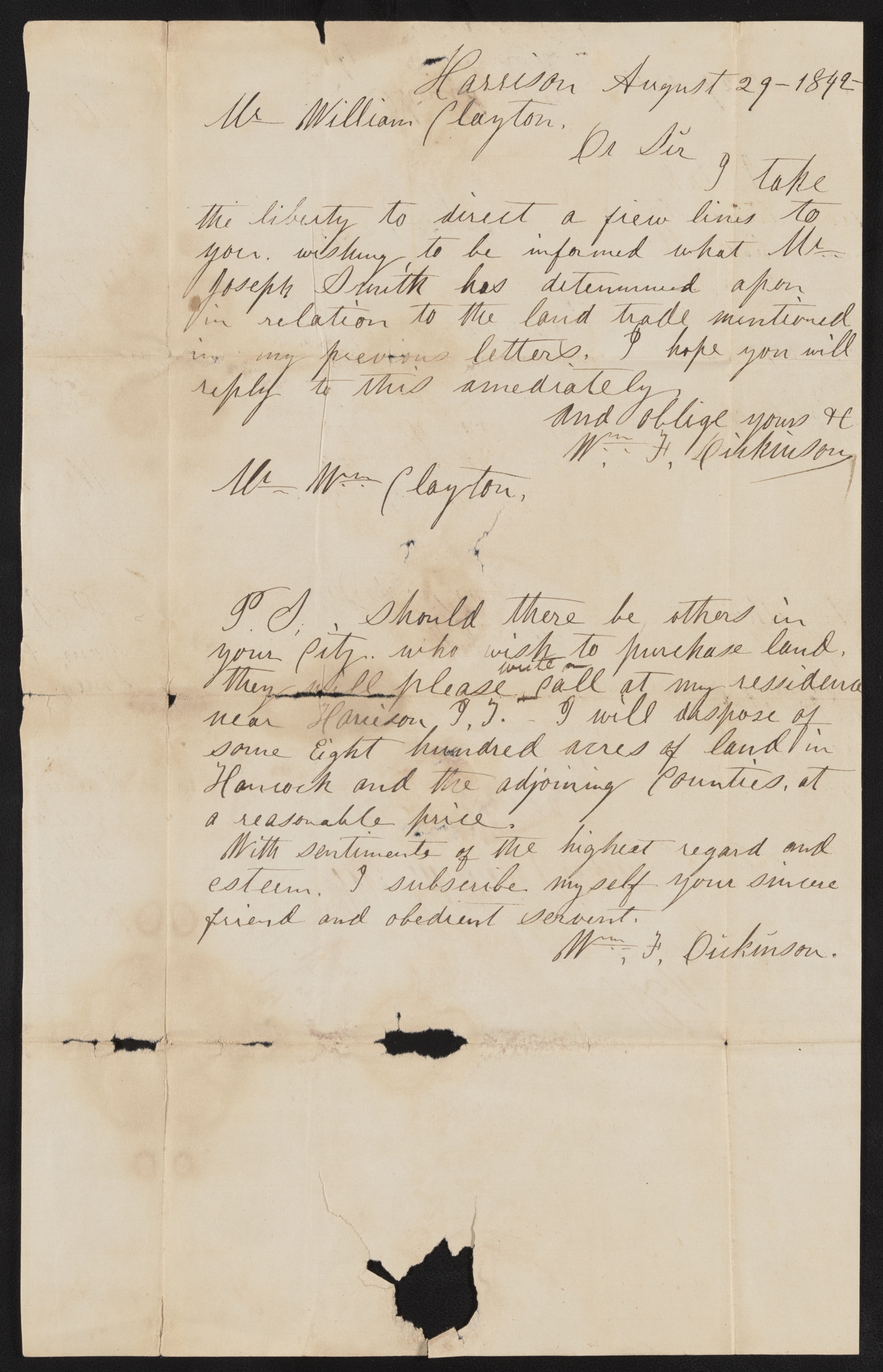 William F. Dickinson, Letter, Harrison, Lee Co., Iowa Territory, to , , Hancock Co., IL, 29 Aug. 1842; handwriting and signatures presumably of William F. Dickinson; docket and endorsement in handwriting of ; one page; Newel K. Whitney, Papers, BYU. Includes address, postal notations, and archival marking.