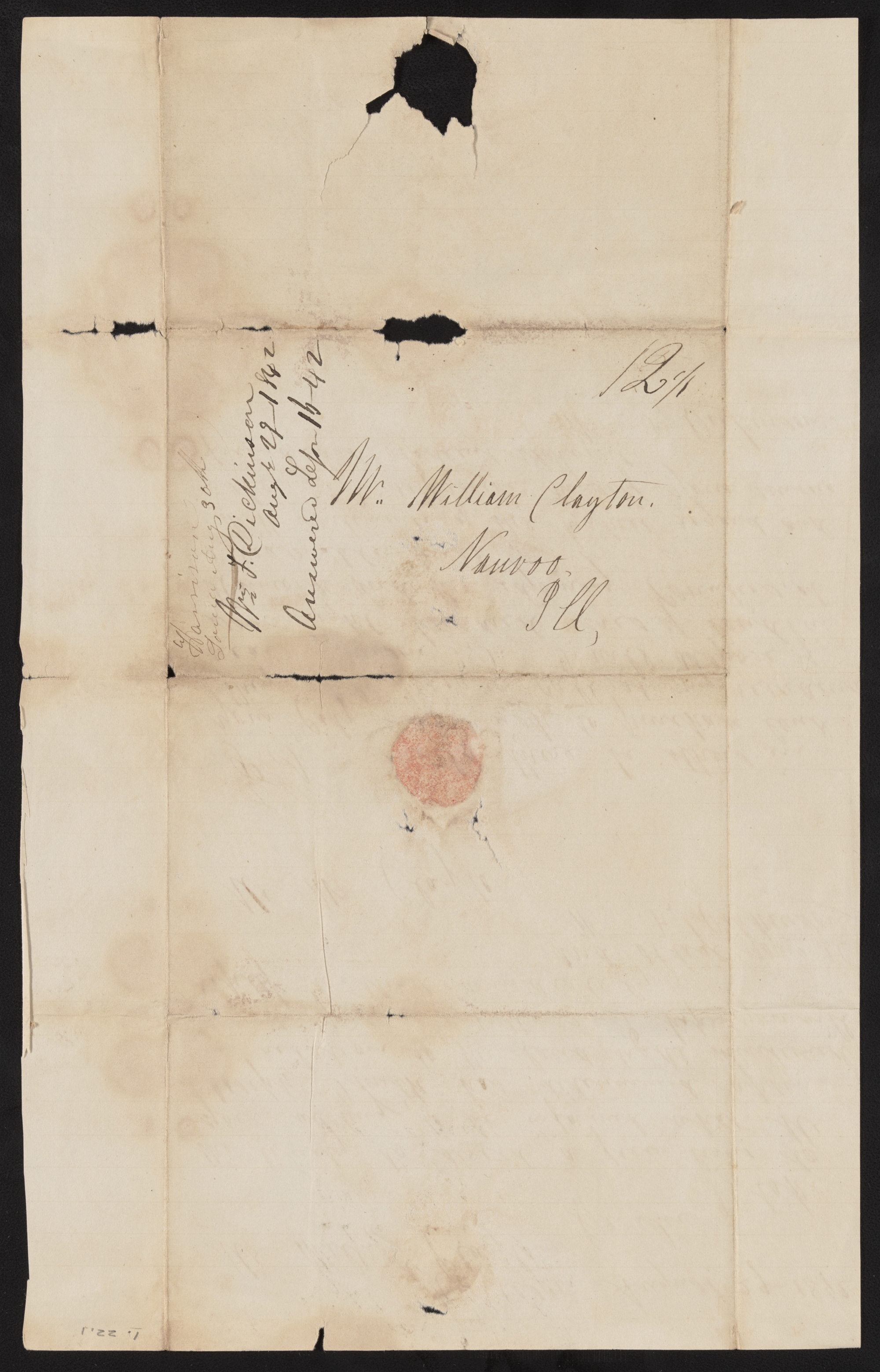 William F. Dickinson, Letter, Harrison, Lee Co., Iowa Territory, to , , Hancock Co., IL, 29 Aug. 1842; handwriting and signatures presumably of William F. Dickinson; docket and endorsement in handwriting of ; one page; Newel K. Whitney, Papers, BYU. Includes address, postal notations, and archival marking.
