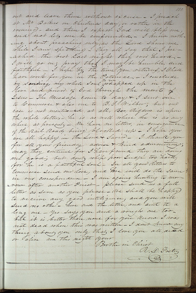 out and leave them without excuse— I preach at Mr. Bakers on Christmas day, or rather in the evening— and then I expect God will bless me, and not let me be confounded— I know nothing about preaching, only, as the Lord shows me while I am speaking— They all say that I preached the best last night they ever heard— I will go on; pray that I may be humble and faithful— I hope by the time you returns, I shall have work for you in the Potomac— I conclude by sending my whole soul <to you> wrapped up in the love and power of God through the merits of Jesus— The message come to day & I sent one to & also one to ; but our case is not mentioned at all, is upon the whole better— he is as well where he is as any where, at present— We have no letters, in consequence of the Rail Road being blocked up— I hope you are all happy in the Lord & Savior— I thank you for all your friendly advise & kind admonitions; may they continue for I have found they are doing me good; but dont whip poor Judge too hard, for he is a faithful soul— In all your letters to send our love, and we will do the same in our correspondence— I am agoing hunting to morrow after another Priest— please send us a full letter as soon as you please— We shall be happy to receive any good inteligence, and you will send no othe[r]— here ends the letter, and aint it a long one— Yes says you and a rough one too— but it is better than none for you know I was not dead when this was written— I dont know any thing about you only that I love you all, dead or alive am this night your