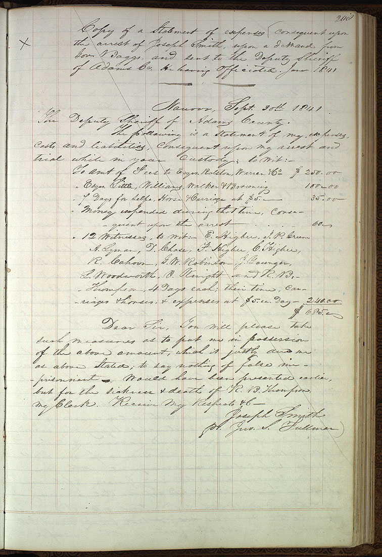 Copy of a Statement of expenses consequent upon the arrest of Joseph Smith, upon a demand from Govr , and sent to the Deputy Sheriff of He having Officiated. June 1841