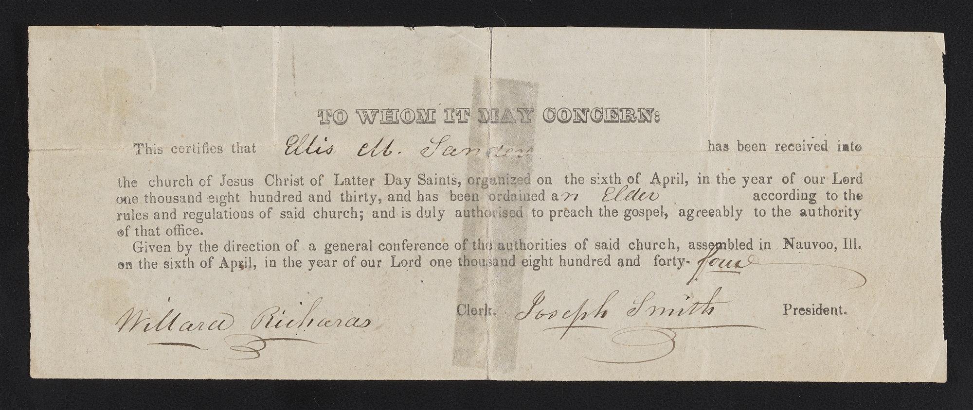 JS, License, , Hancock Co., IL, for , 13 May 1844; printed form with manuscript additions in handwriting of ; notation in handwriting of ; one page; June E. and Maida Russell Moody, Collection, BYU.