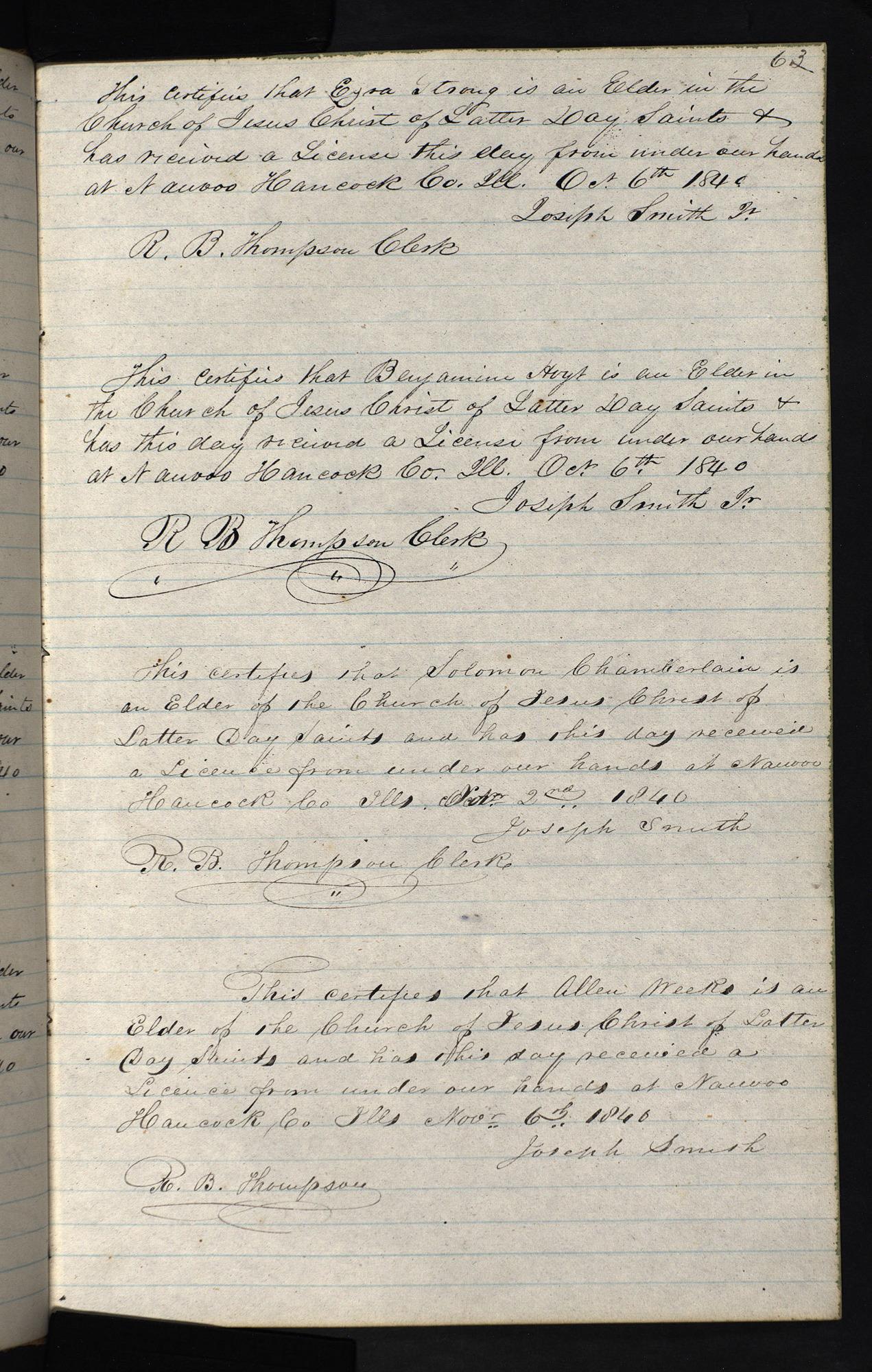 JS, License, [, Hancock Co., IL], for Ezra Strong Jr., 6 Oct. 1840. Extract copied [between ca. 26 Oct. and 2 Nov. 1840] in General Church Record, License Record Book, p. 63; handwriting of ; CHL. For more complete source information, see the source note for License Record Book.