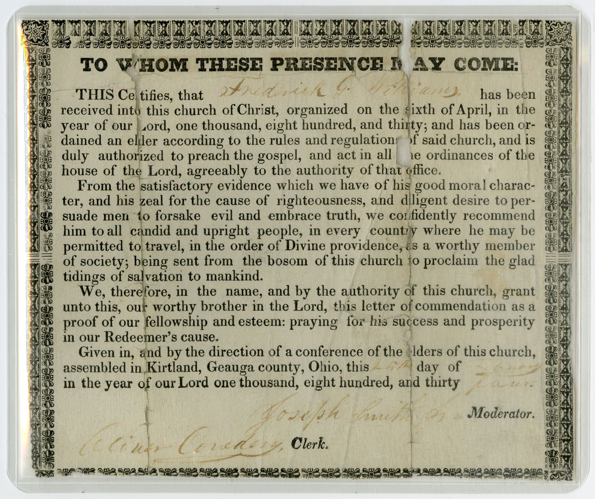 Elder’s Certificate for Daniel Kent, 20 Sept. 1836. CHL. MS 20640.