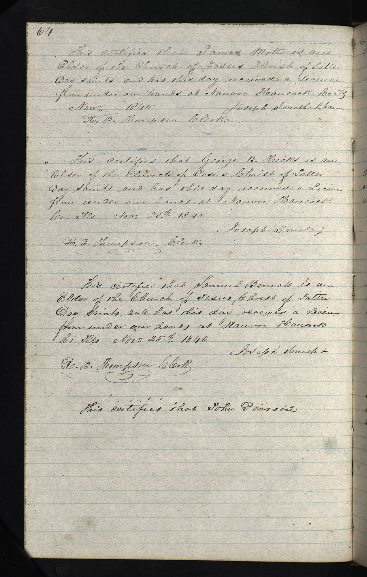 JS, License, [, Hancock Co., IL], for James Mott, between 6 and 25 Nov. 1840. Extract copied [between ca. 6 and 25 Nov. 1840] in General Church Record, License Record Book, p. 64; handwriting of ; CHL. For more complete source information, see the source note for License Record Book.
