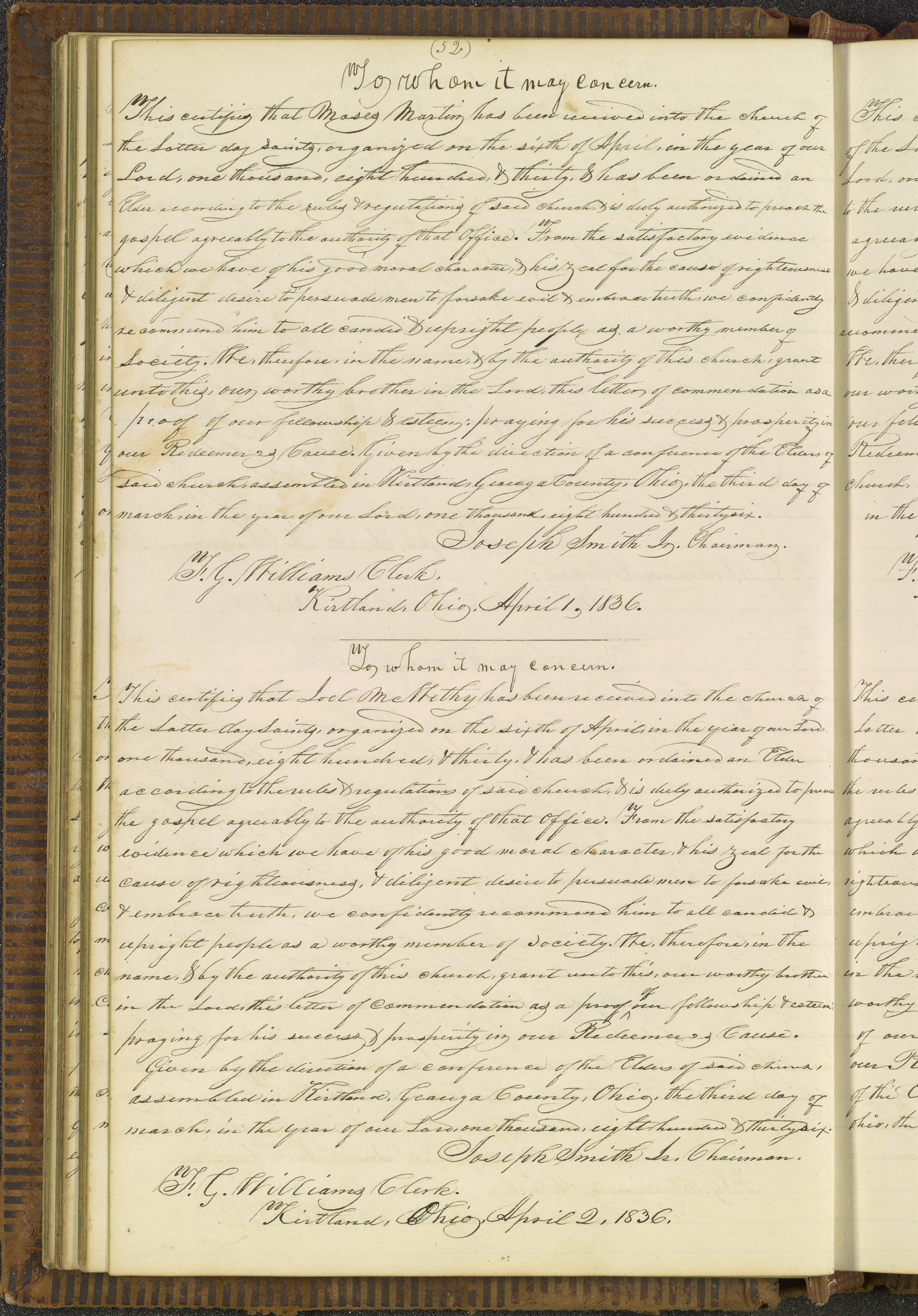 JS and , License, for Joel McWithey, , Geauga Co., OH, 2 Apr. 1836. Version copied [ca. 2 Apr. 1836] in Kirtland Elders’ Certificates, p. 52; handwriting of ; CHL.