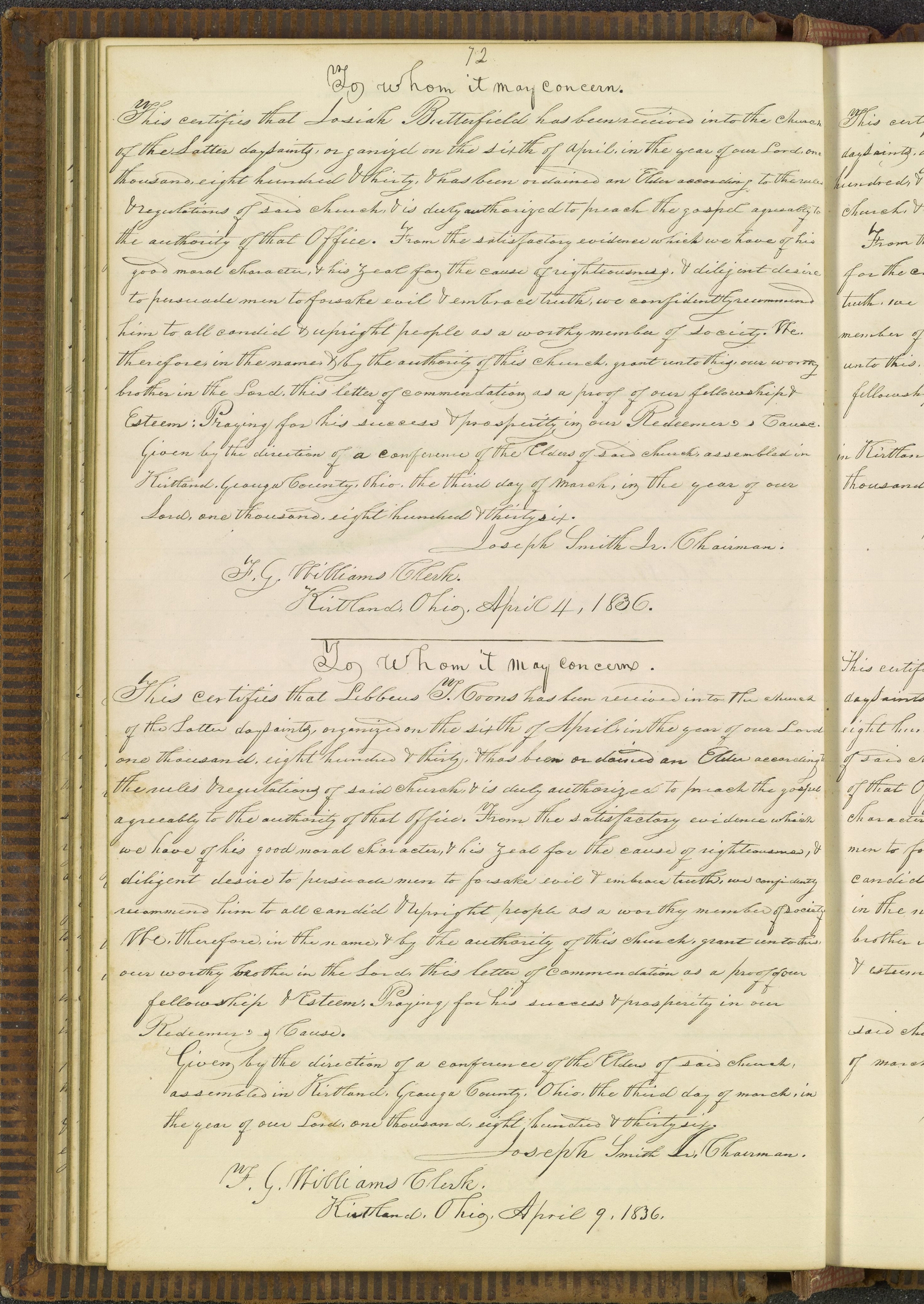 JS and , License, for , , Geauga Co., OH, 4 Apr. 1836. Version copied [between ca. 7 and ca. 9 Apr. 1836] in Kirtland Elders’ Certificates, p. 72; handwriting of ; CHL.