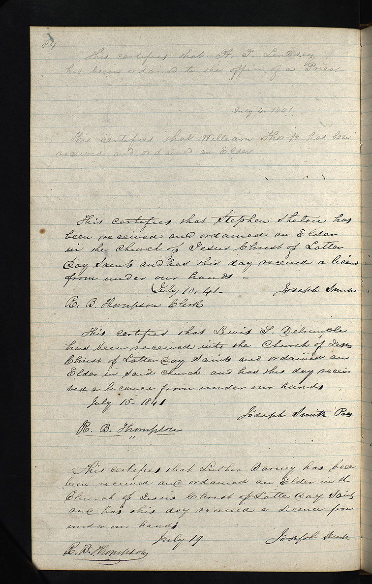 JS, License, , Hancock Co., IL, for , 19 July 1841. Extract copied [ca. 19 July 1841] in General Church Record, License Record Book, p. 84; handwriting of ; CHL. For more complete source information, see the source note for License Record Book.