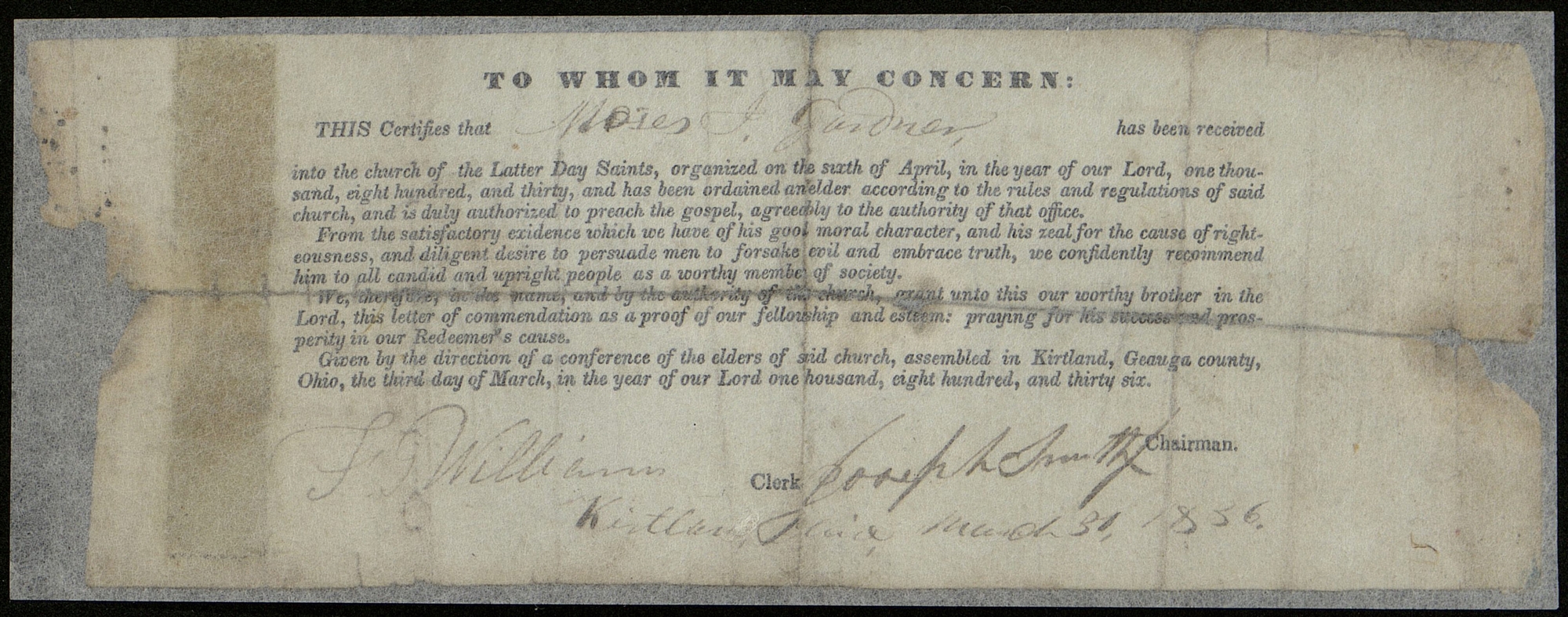 THIS Certifies that Moses J. Gardner, has been received into the , organized on the sixth of April, in the year of our Lord, one thousand, eight hundred, and thirty, and has been an according to the rules and regulations of said church, and is duly authorized to preach the gospel, agreeably to the authority of that office.