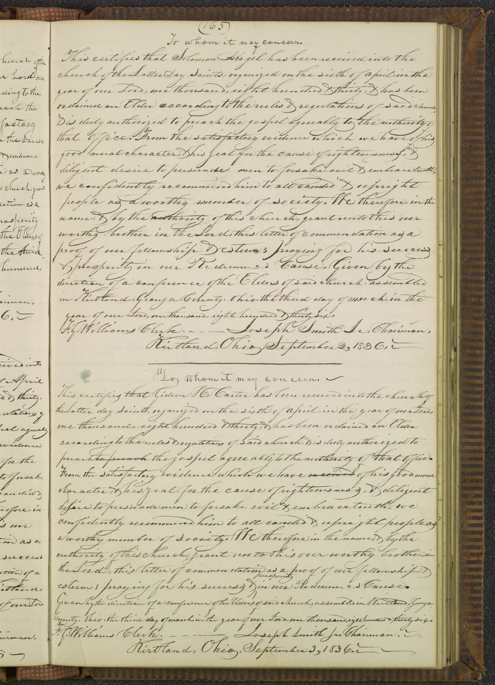 This certifies that has been received into the , organized on the sixth of april, in the year of our Lord, one thousand, eight hundred & thirty, & has been an according to the rules & regulations of said church, & is duly authorized to preach the gospel agreeably to the authority of that office. From the satisfactory evidence which we have of his good moral character, & his zeal for the cause of righteousness, & diligent desire to persuade men to forsake evil & embrace truth, we confidently recommend him to all candid & upright people as a worthy member of society. We therefore, in the name, & by the authority of this church, grant unto this our worthy brother in the Lord, this letter of commendation as a proof of our fellowship & esteem: praying for his success & prosperity in our Redeemer’s Cause. Given by the direction of a conference of the Elders of said church, assembled in , Geauga County, Ohio, the third day of march, in the year of our Lord, one thousand, eight hundred & thirty six.