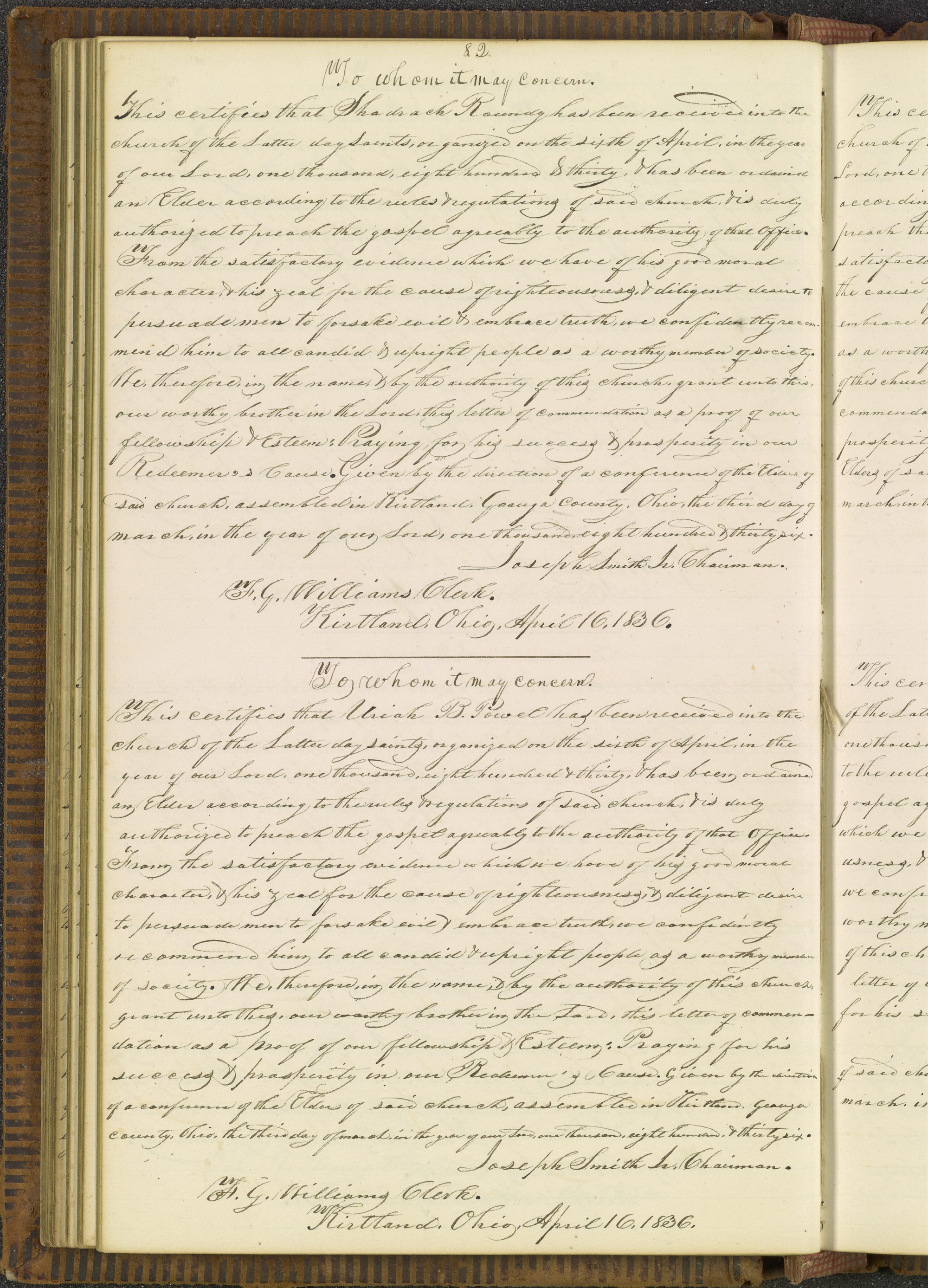 JS and , License, for , , Geauga Co., OH, 16 Apr. 1836. Version copied [ca. 16 Apr. 1836] in Kirtland Elders’ Certificates, p. 82; handwriting of ; CHL.