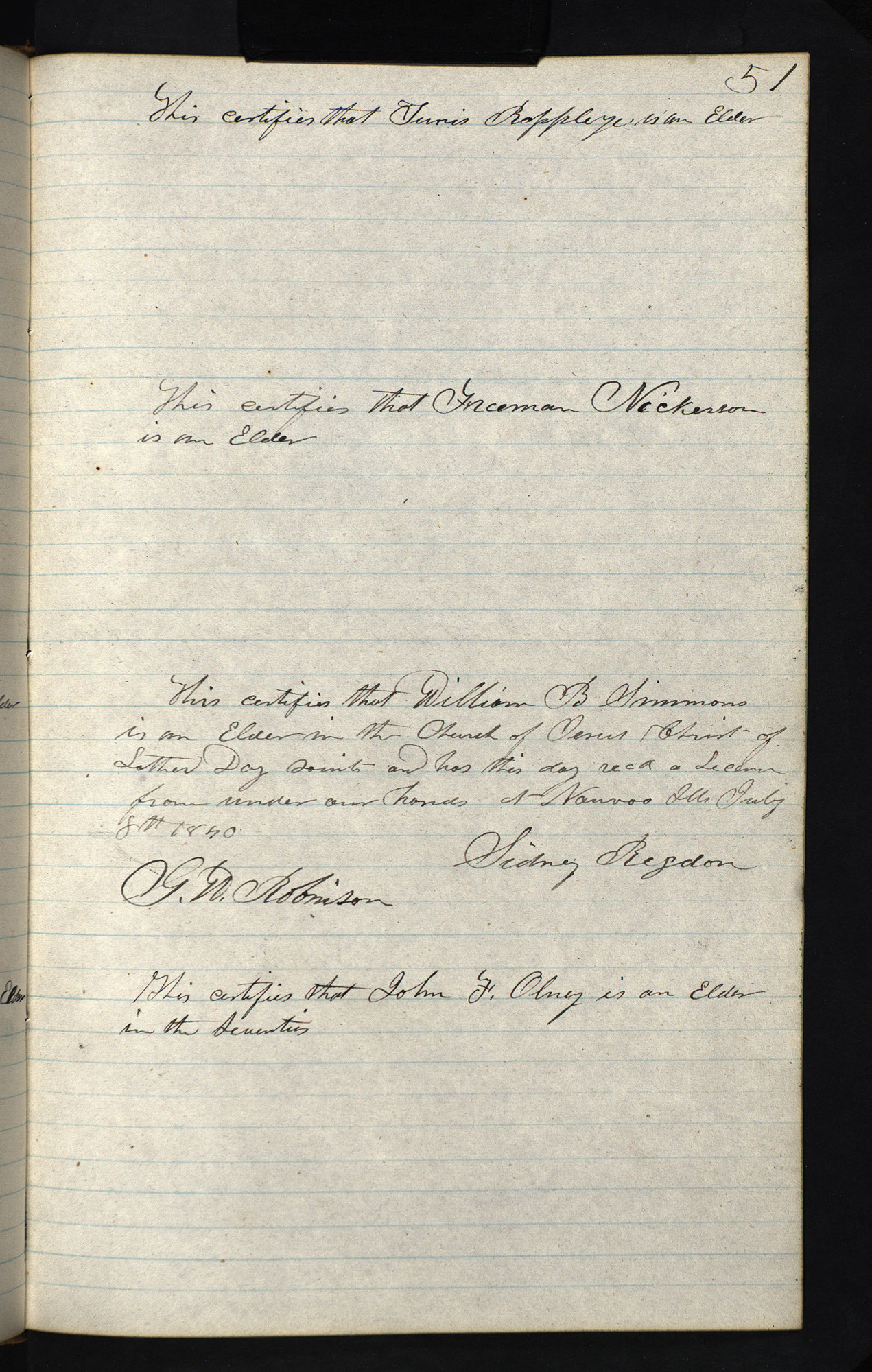 , License, [, Hancock Co., IL], for William B. Simmons, 8 July 1840. Extract copied [ca. 8 July 1840] in General Church Record, License Record Book, p. 51; handwriting of ; CHL. For more complete source information, see the source note for License Record Book.