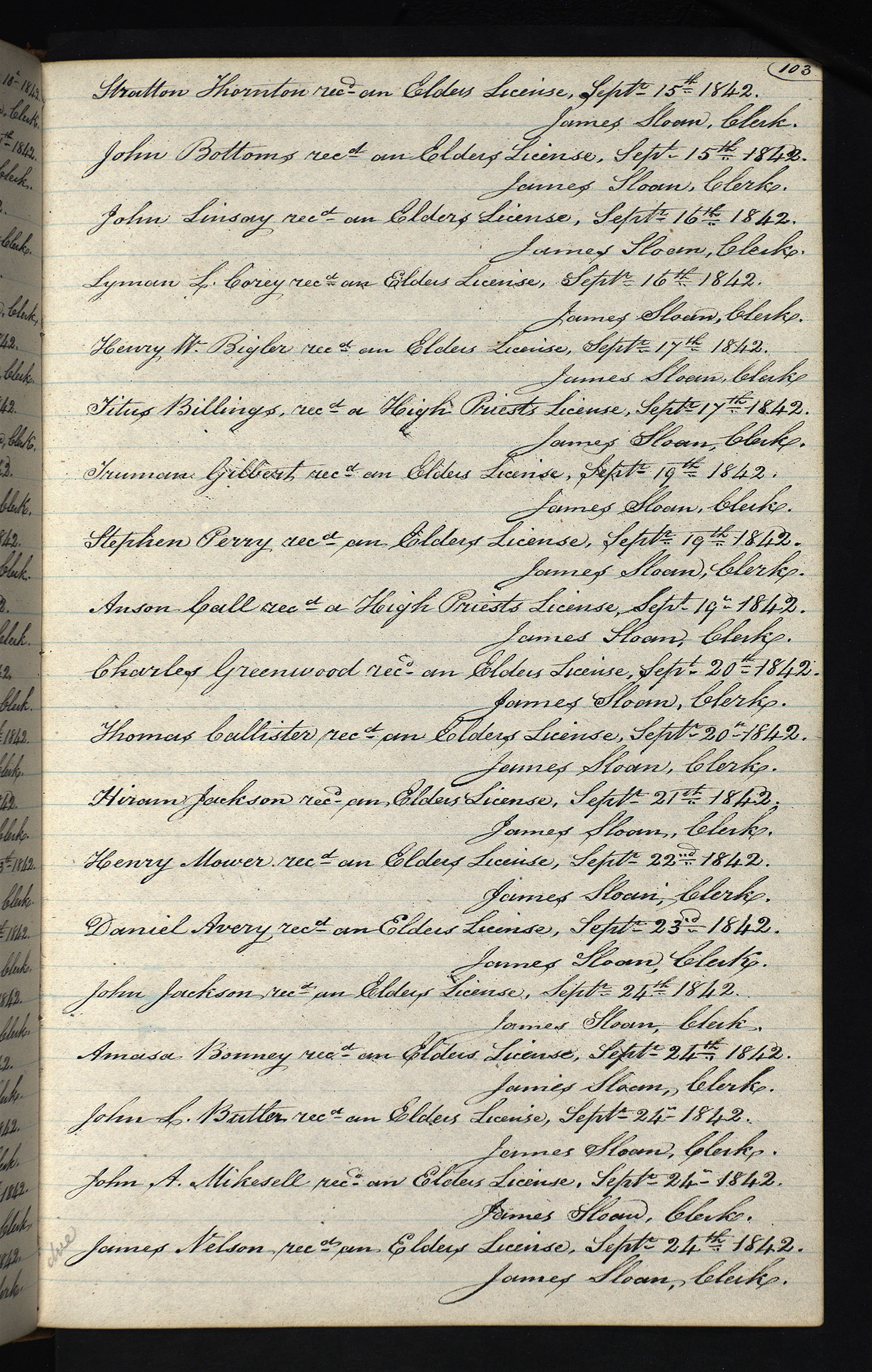 recd an Elders License Septr 24[th] 1842.