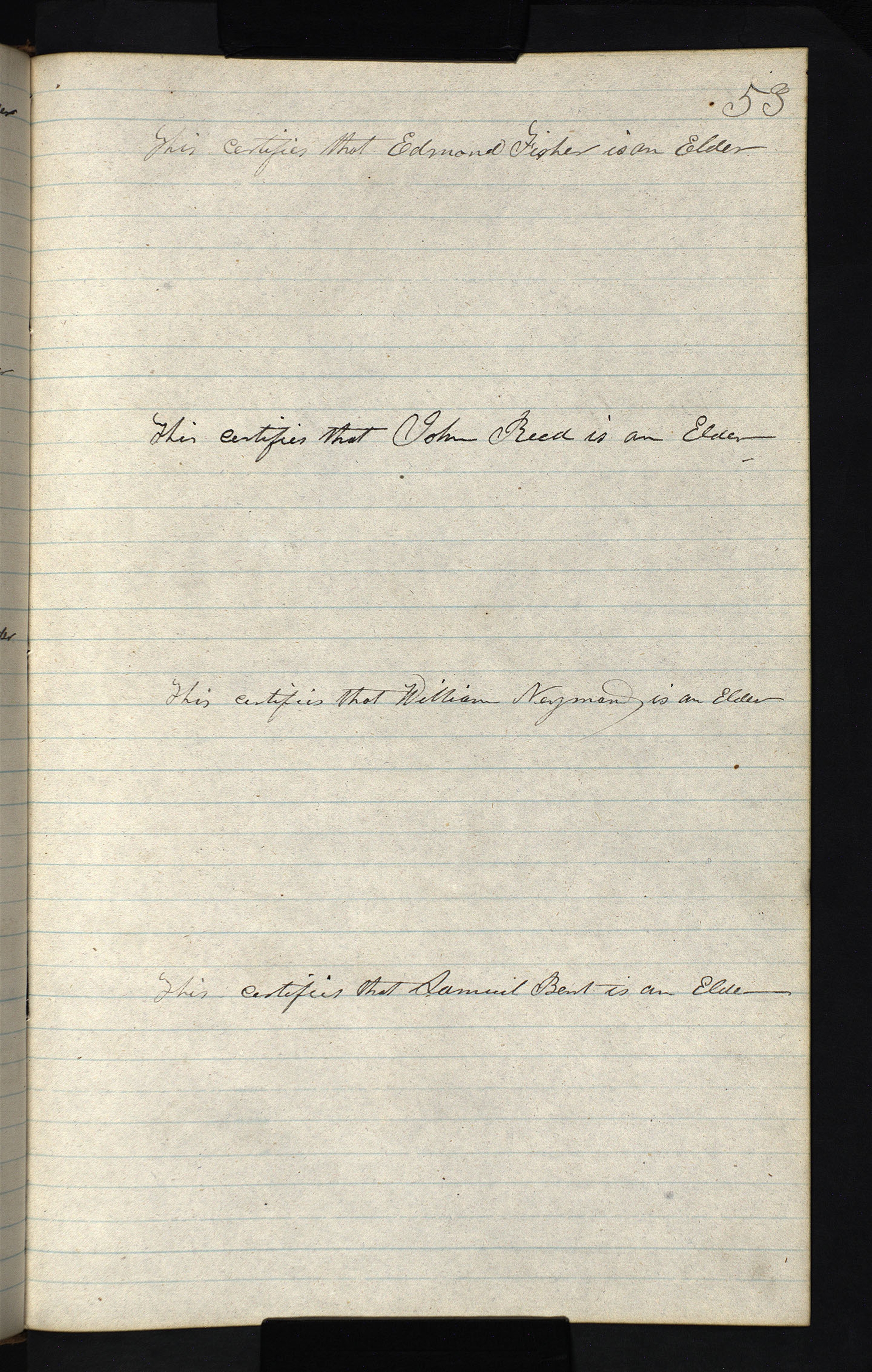 On 6 December 1837, was appointed the “Recording Clerk” for elders’ licenses signed by the (Missouri) church presidency. Cowdery began copying licenses two days later. He may have already been in possession of this volume, as the first page contains a copy of the minutes of a 26 February 1836 meeting in , during which Cowdery, , and were appointed as a committee “to draft rules and regulations concerning licenses.” It is unclear when Cowdery copied these minutes into the volume. Cowdery continued recording licenses in his capacity as recording clerk until 3 February 1838. On 10 February, the high council and bishopric stripped Cowdery of his position as recording clerk because of his role in a dispute between the recently rejected Zion presidency and other church leaders.