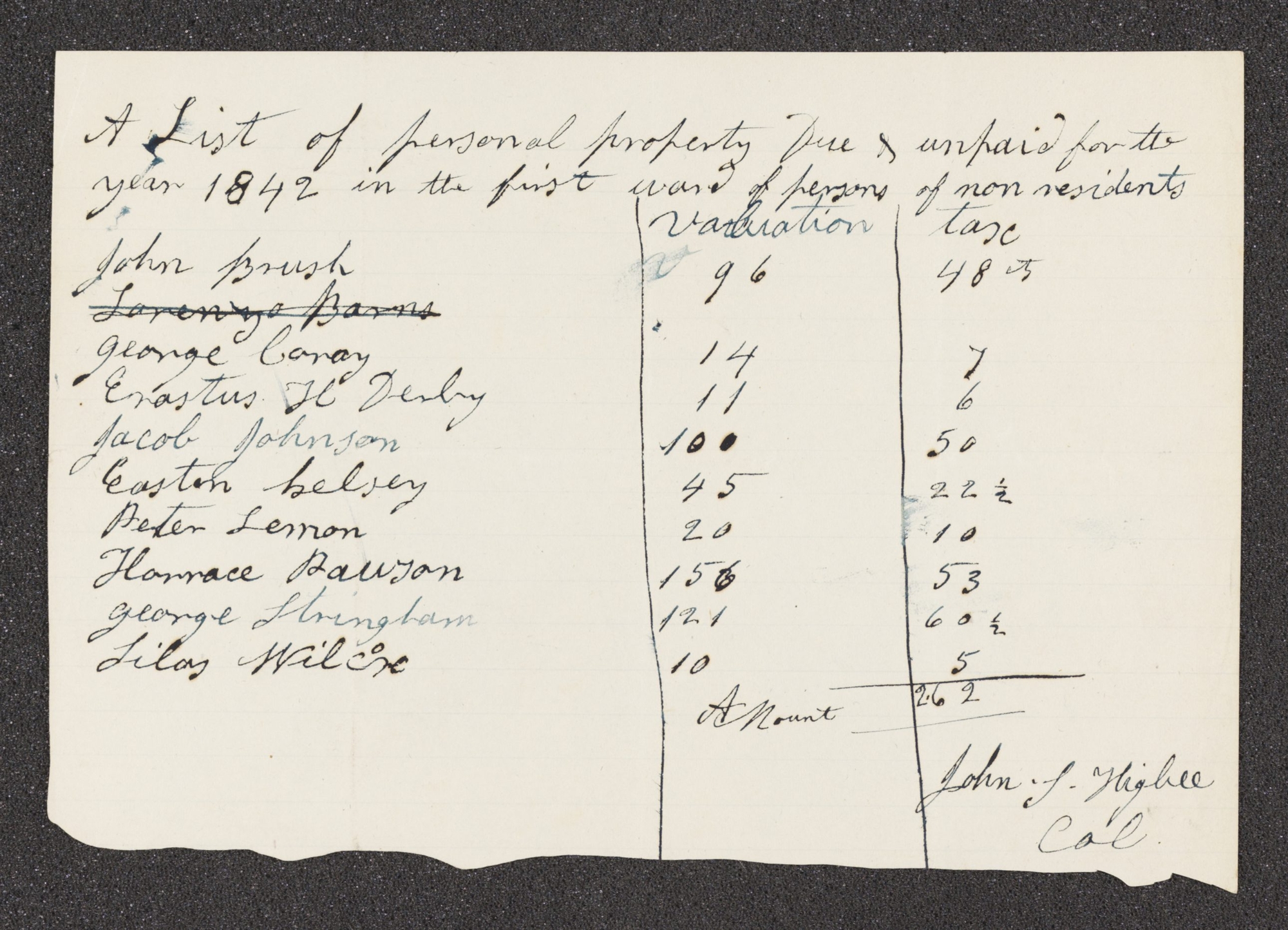 , List of Delinquent Taxes for Personal Property, first ward for 1842, , Hancock Co., IL, ca. Jan. 1844; handwriting of ; one page; Nauvoo, IL, Records, 1841–1845, CHL.